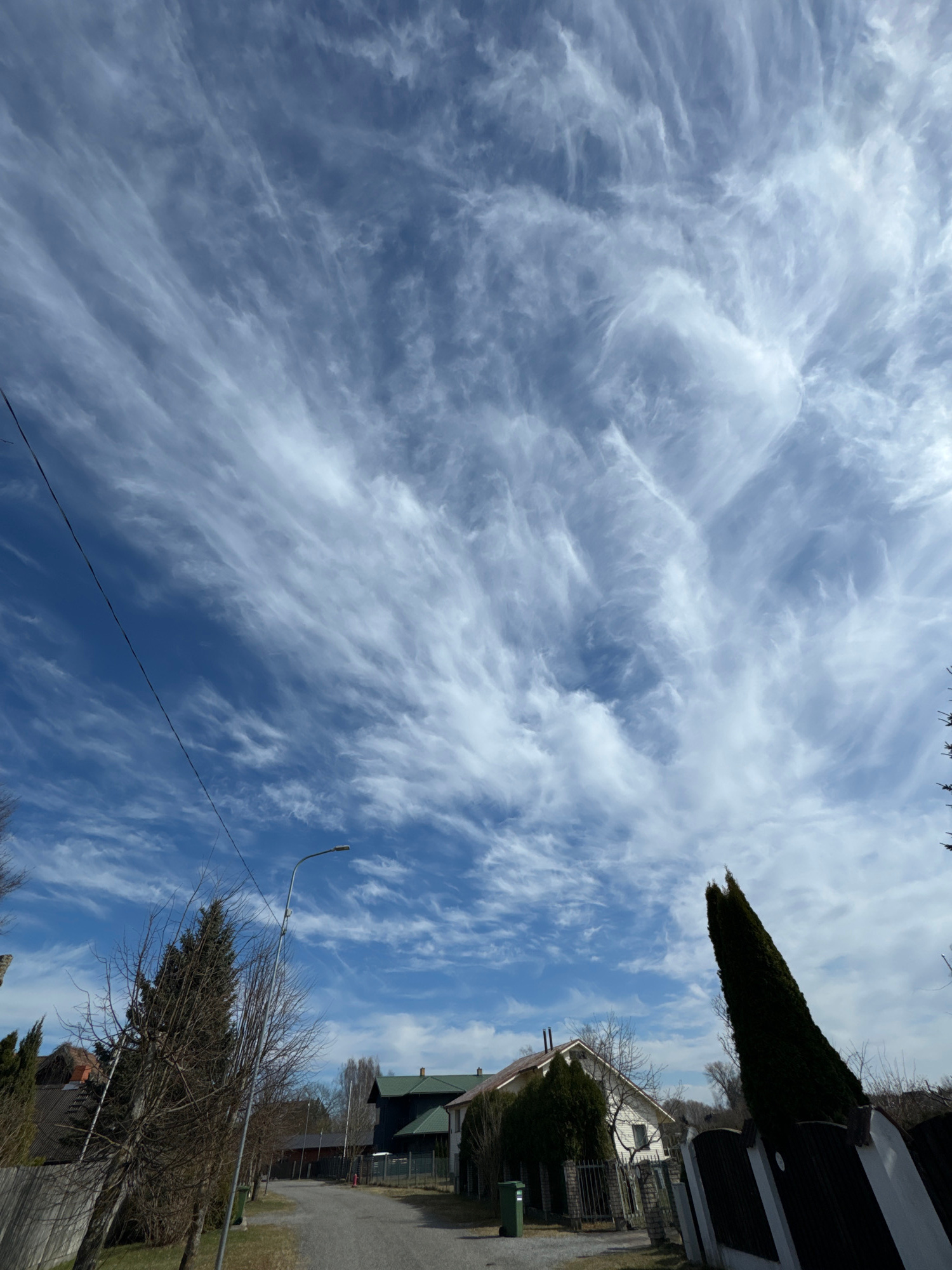 The image depicts a view of the sky over a residential area, likely in Carnikava, Latvia. The sky is filled with cirrus clouds, creating a streaked and feathered appearance against a blue background.…read more