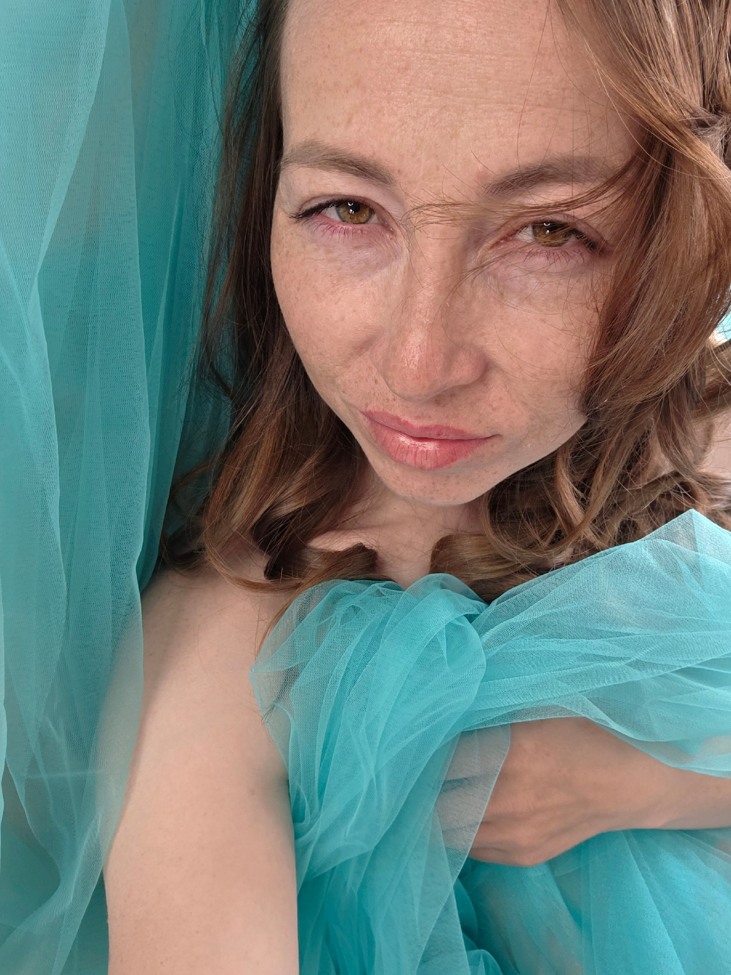 A woman with freckles and auburn hair is lying down, partially covered by a light blue sheer fabric. The image appears to be taken from a close-up, slightly overhead perspective. No information is ava…read more