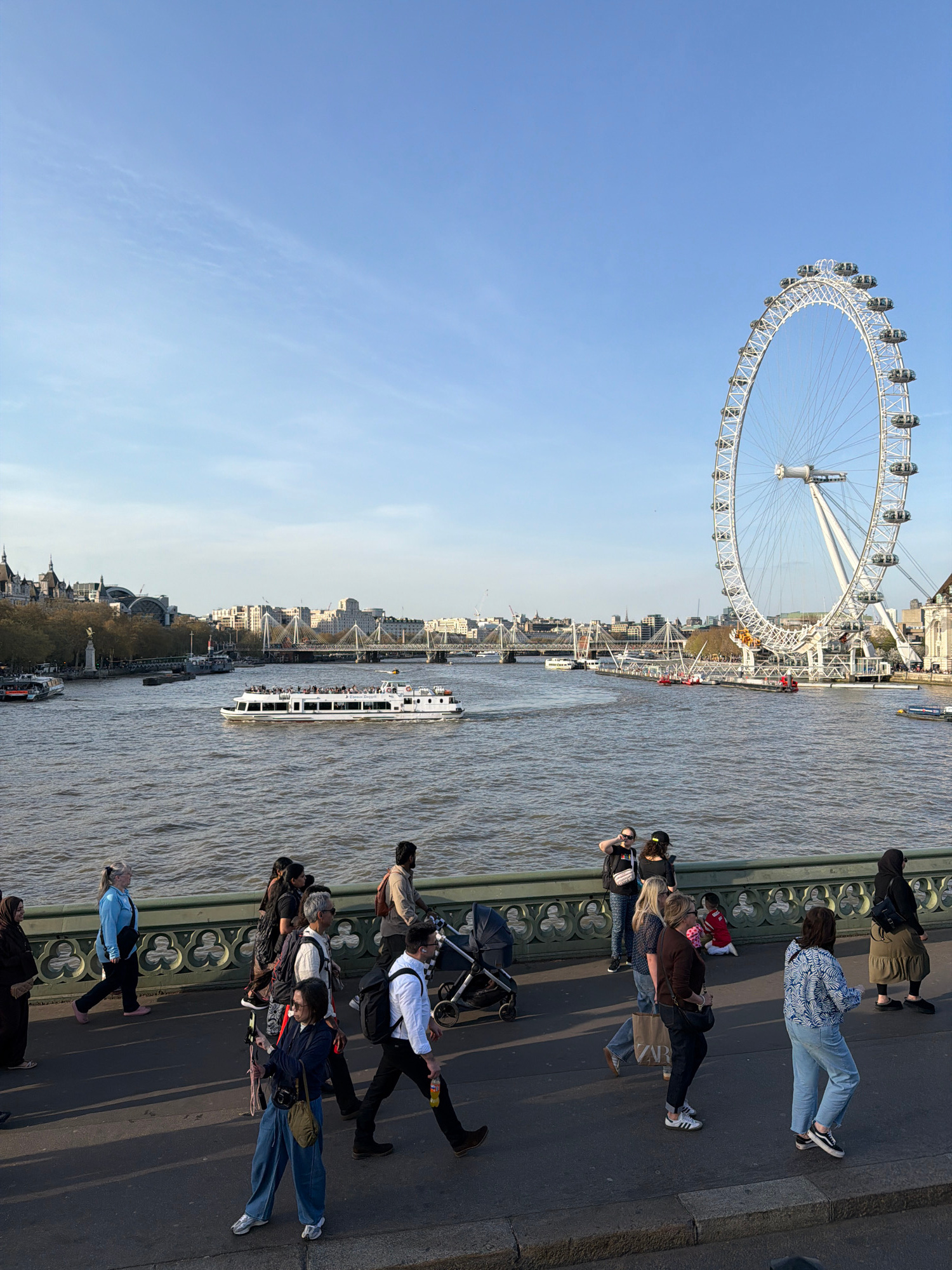 This image shows a view in London, United Kingdom. The London Eye ferris wheel is visible against a blue sky. A body of water, likely the River Thames, stretches through the scene. A boat is in the ri…read more
