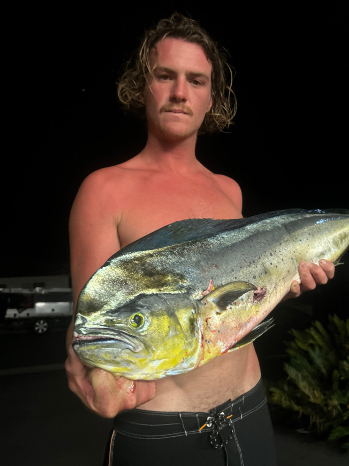 A male individual is depicted holding a large fish outdoors at night, in Bulli, Australia. The subject is a Caucasian male, appearing to be in his 20s or 30s, with light brown, wavy, mid-length hair a…read more
