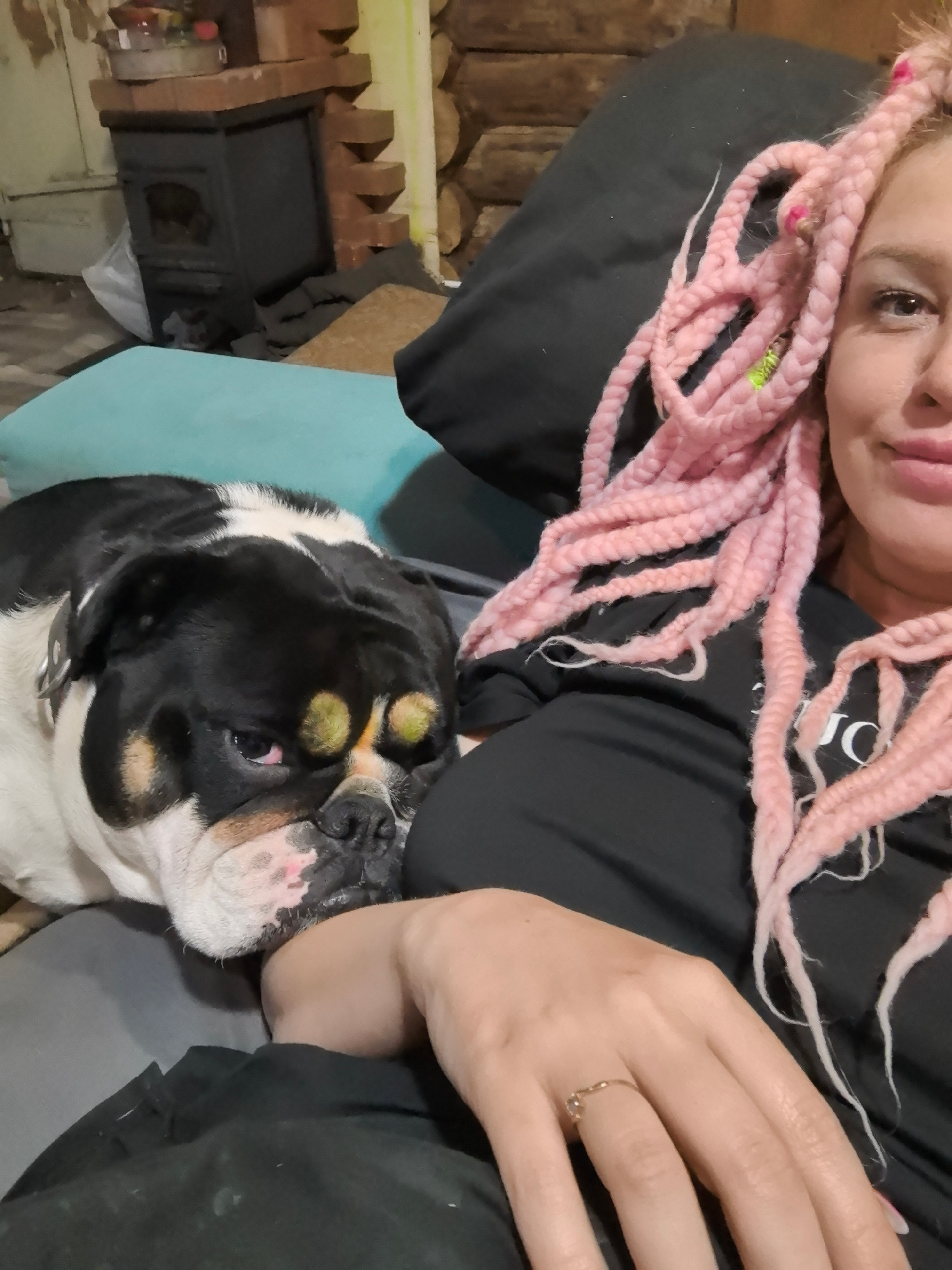 A woman with pink braided hair lies on a bed or couch with a black and white bulldog. The dog rests its head on the woman's arm. The woman is wearing a black shirt. There is a black pillow behind her.…read more