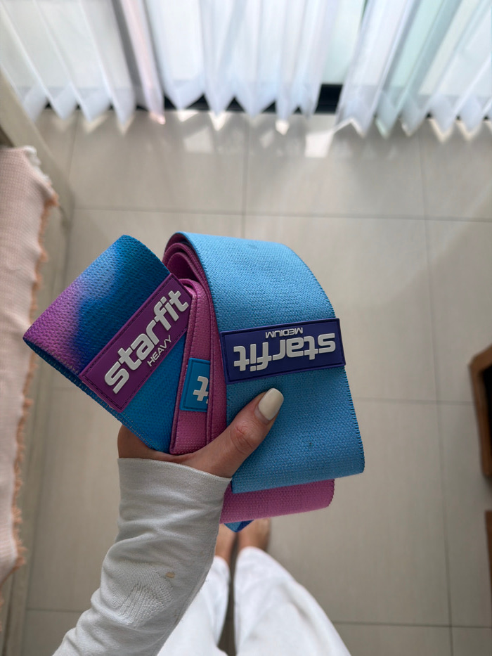 A person's hand holds three Starfit resistance bands. The top band is light blue with "MEDIUM" printed on the tag. Below that is a pink band with a tag. The bottom band has an ombre design transitioni…read more