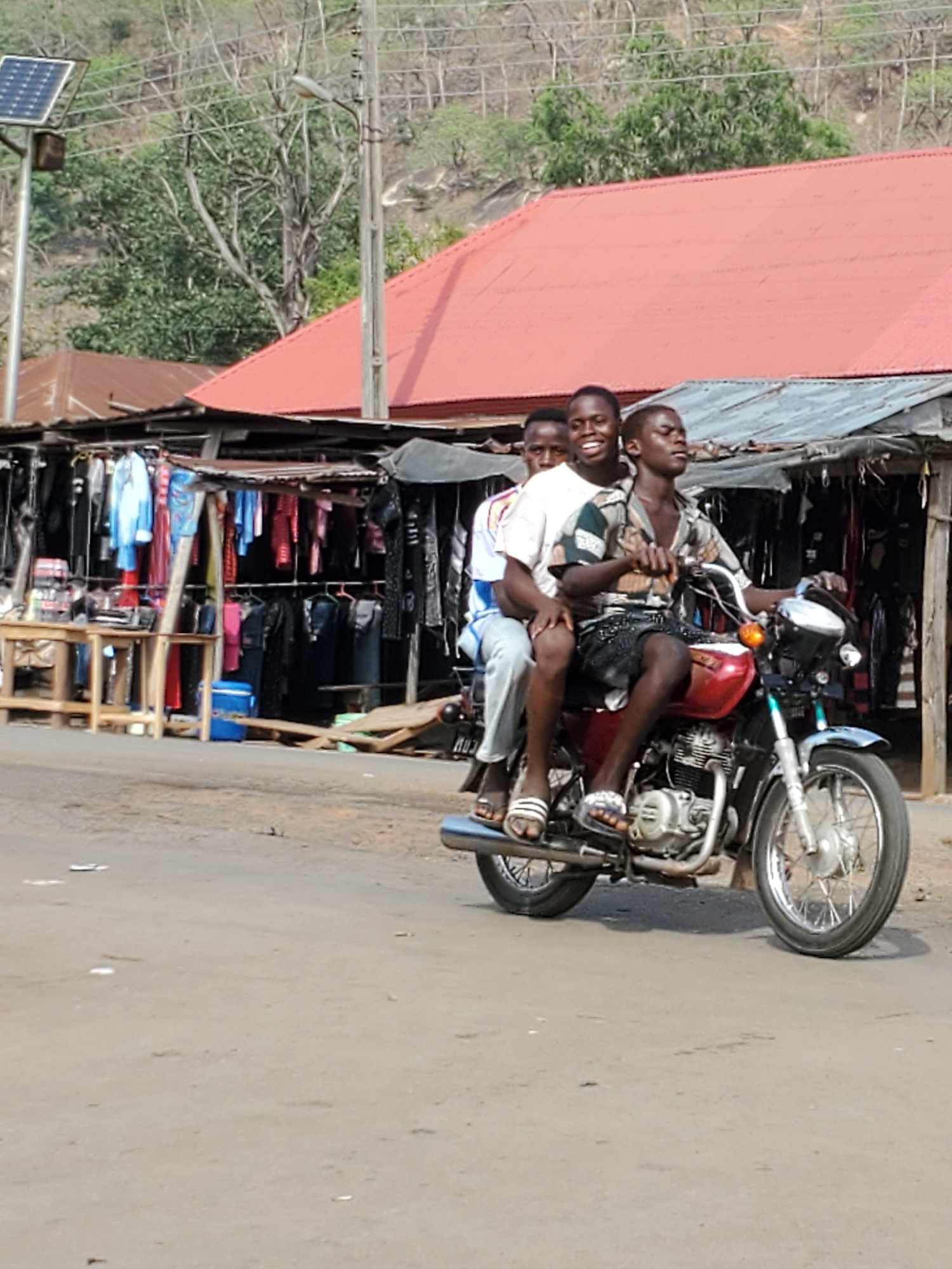The media file captures three young men seated on a red motorcycle on a sunny day in Mararaba, Nigeria. The motorcycle is stationary on a dirt or unpaved road. All three individuals are smiling or lau…read more