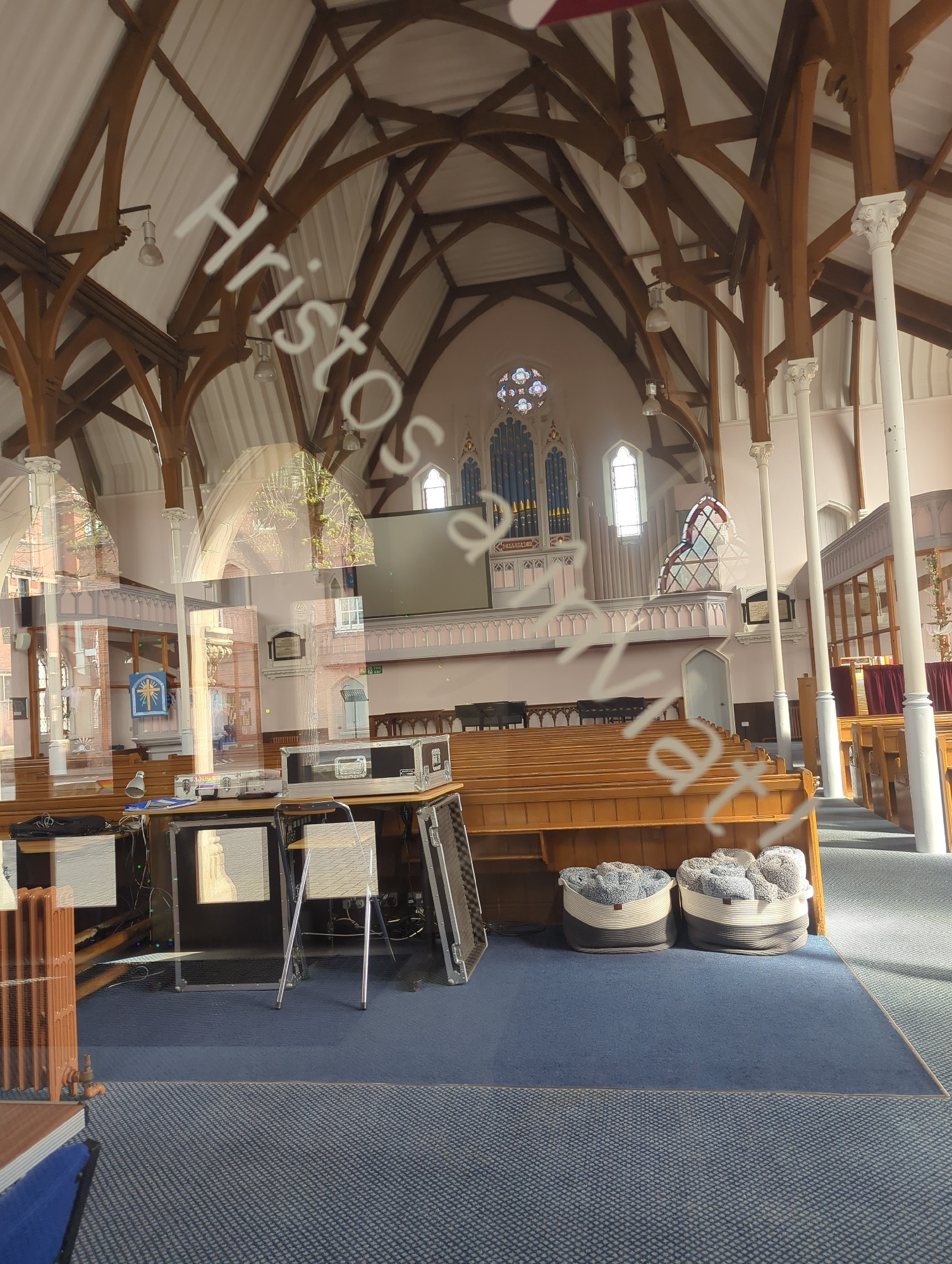 The image shows the interior of a church in Worcester, United Kingdom. The architectural style features a high vaulted ceiling with exposed wooden beams. Stained glass windows are visible in the background. Pews line the sides of the church. Near the front, there is sound equipment, including black cases and monitors, set up for an event. Two white baskets filled with rolled towels are positioned near the pews. A blue carpet covers the aisle. | Open Wire