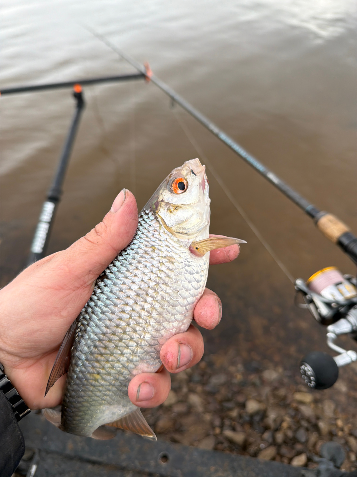 A close-up shot shows a man's hand holding a fish. The fish is silver with an orange eye and is held near a body of water, likely where it was caught. A fishing rod is visible in the background. The l…read more