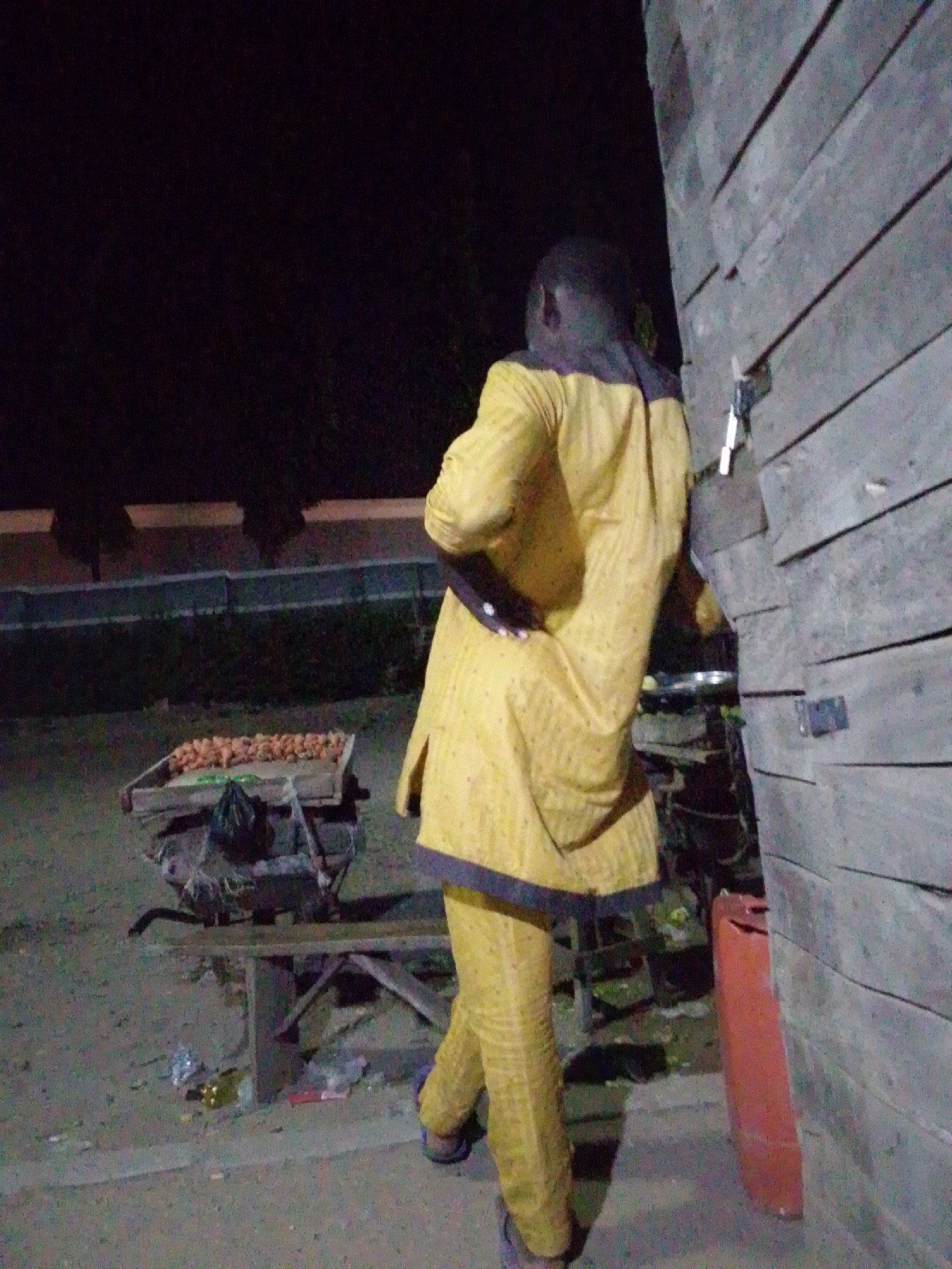In Ajaokuta, Nigeria, at night, a person wearing a yellow outfit stands near a wooden structure, next to a cart loaded with objects, possibly produce. Debris litters the ground.