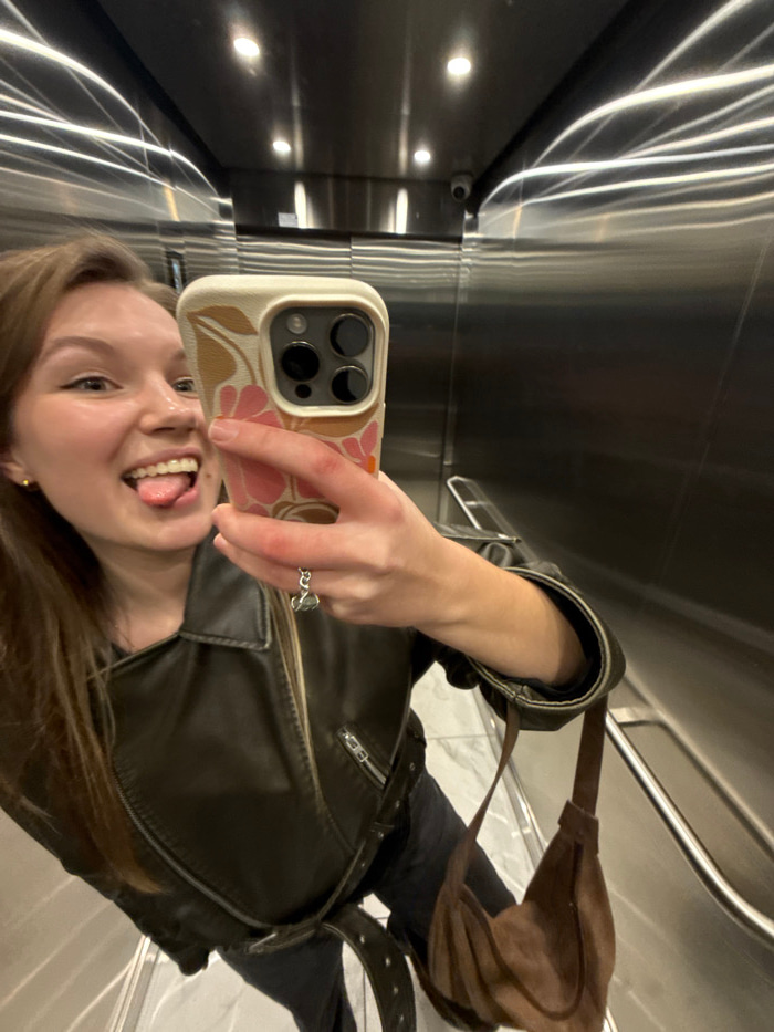 The image displays a young female taking a selfie reflection inside a modern elevator. The subject, positioned centrally, has light brown hair and a fair complexion, smiling widely with her tongue ext…read more