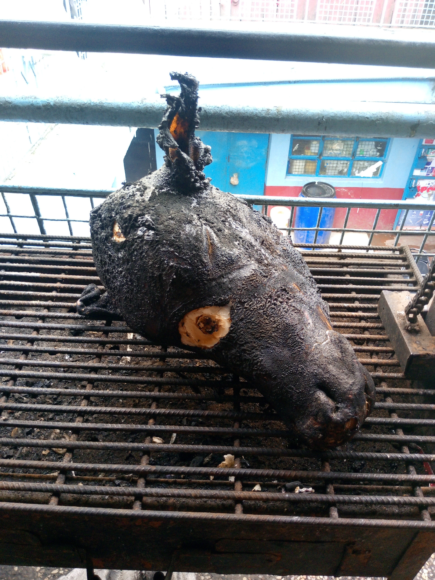 A roasted animal head, likely a goat or sheep, sits on a metal grill. The head is heavily charred, with sections where the skin is split, revealing the meat underneath. The grill is dark and greasy, w…read more