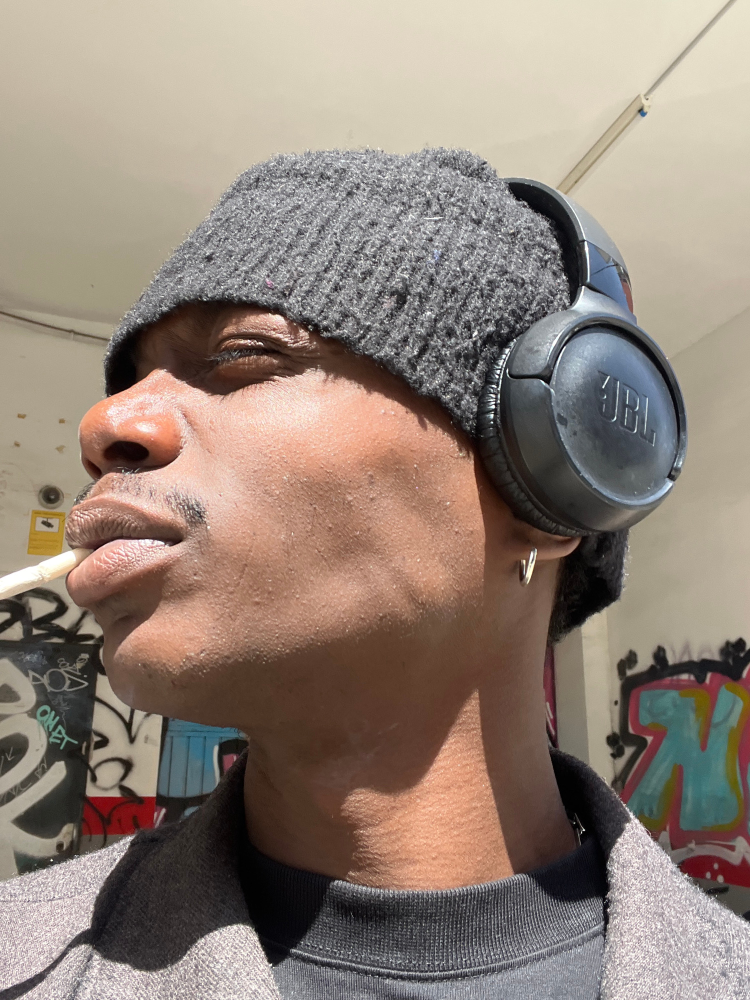 A close-up shot, taken from a low angle, shows a person's face in profile. The person has dark skin, a knit cap, and black JBL headphones. A cigarette is held in the person's mouth. A small hoop earri…read more