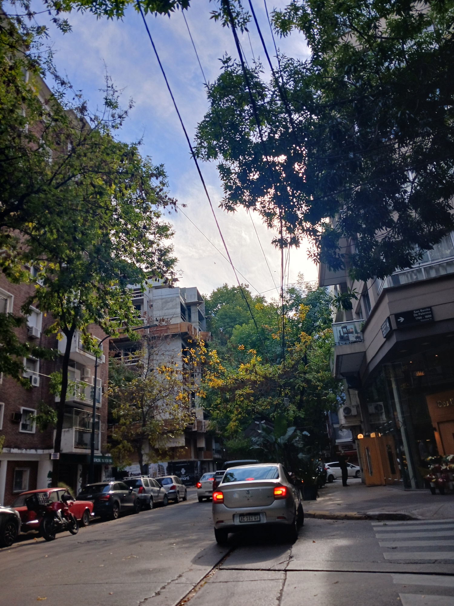 A street scene in Buenos Aires, Argentina, viewed from a low angle. Buildings line both sides of the street, partially obscured by trees. Power lines are visible against a blue sky with scattered clou…read more
