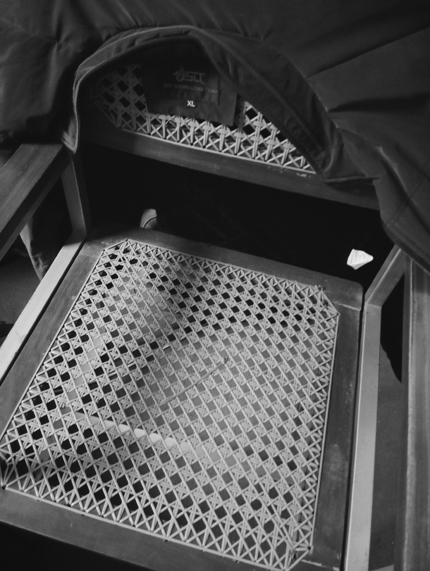 The image shows two chairs with woven seats stacked one on top of the other. A dark jacket is draped over the top chair, with a tag visible reading "STC, SHI SHENG LONG TENG, XL". The environment appe…read more