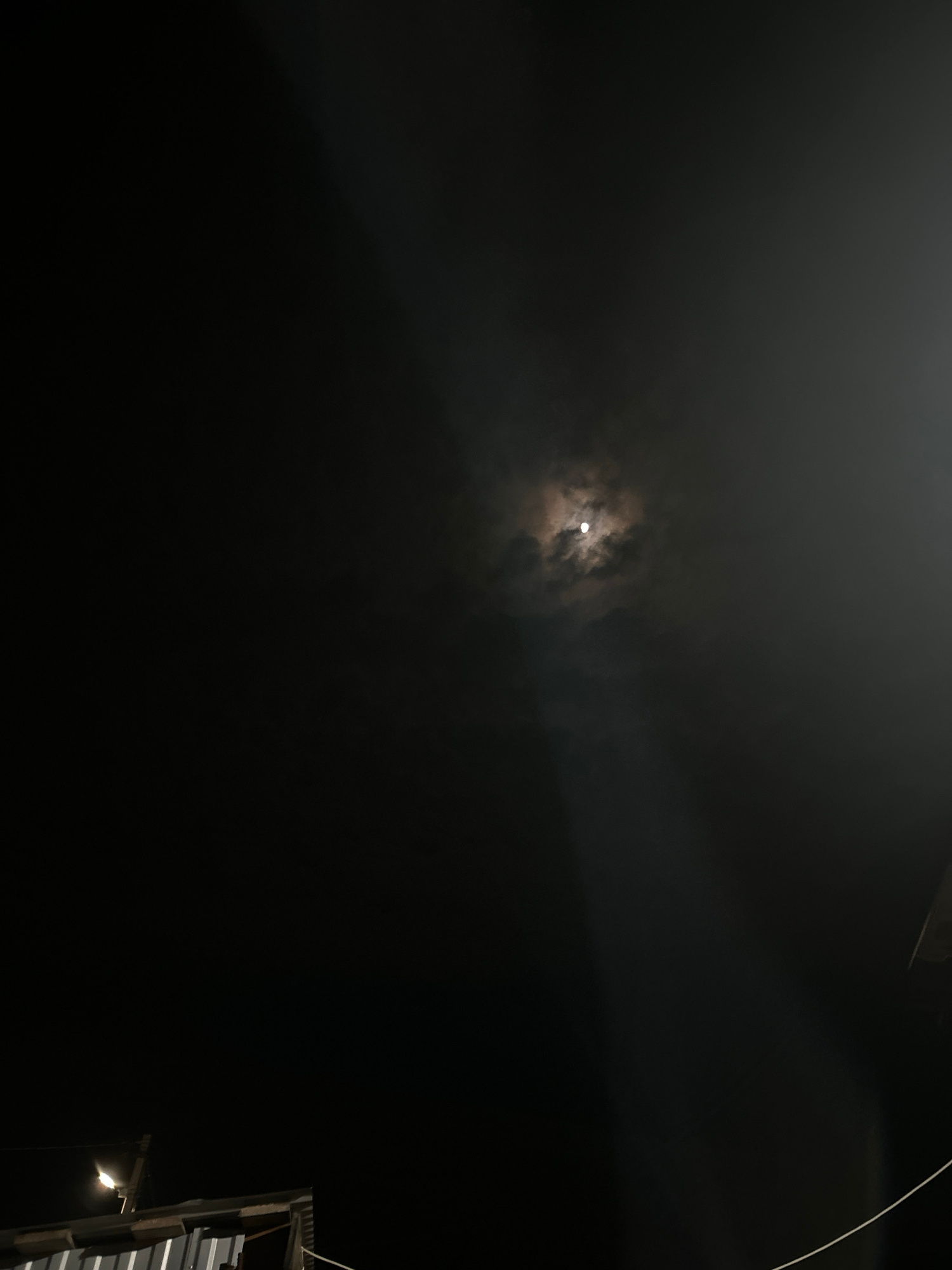 A nighttime scene featuring a moon obscured by clouds in the sky. A building with a metal roof and a streetlight is visible in the lower right corner of the image. The location is not discernible, and…read more