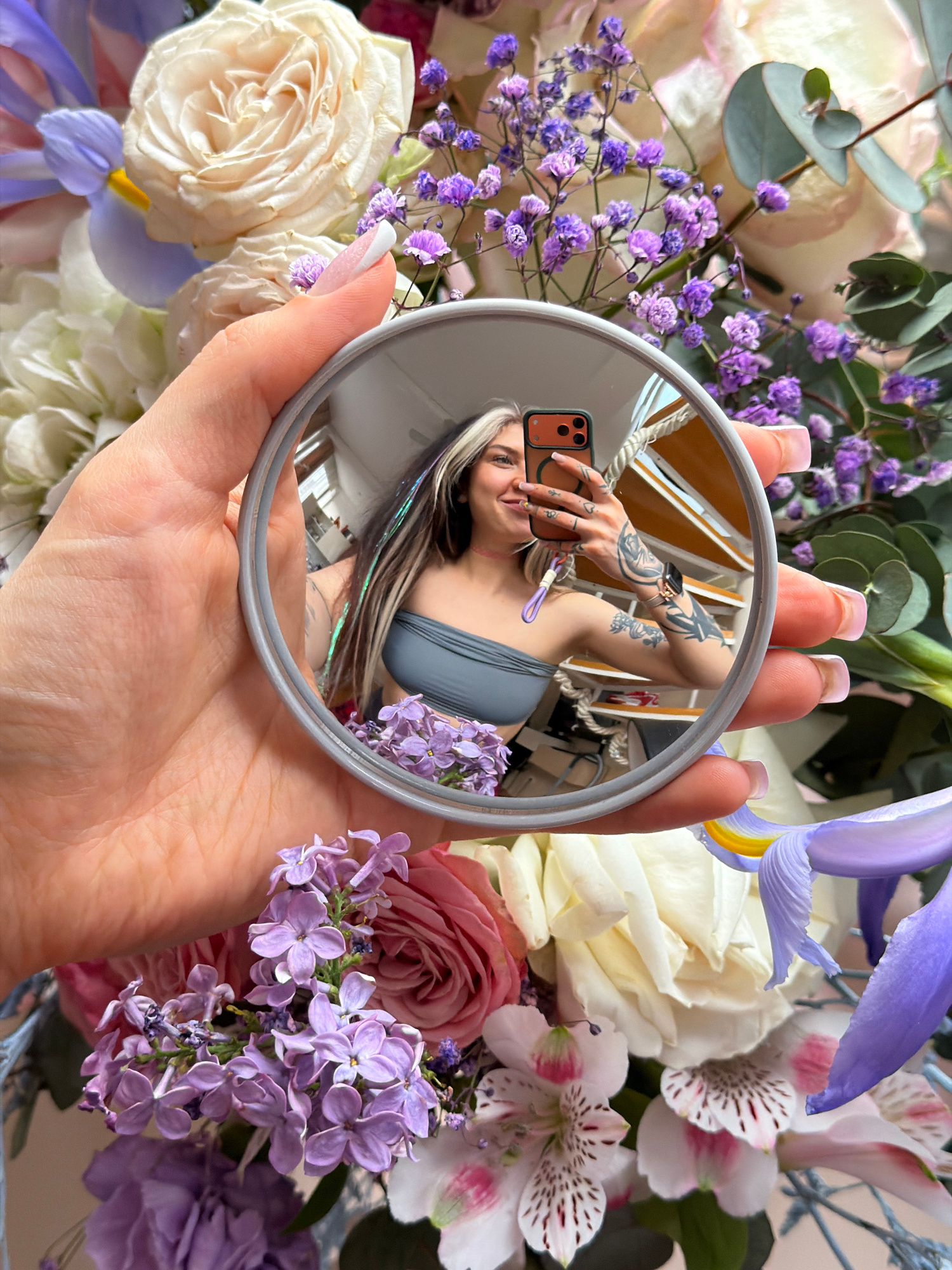 A woman's hand holds a circular mirror against a background of flowers. The mirror reflects the woman, who is taking a picture of herself with a brown iPhone. She is wearing a gray top and has several…read more