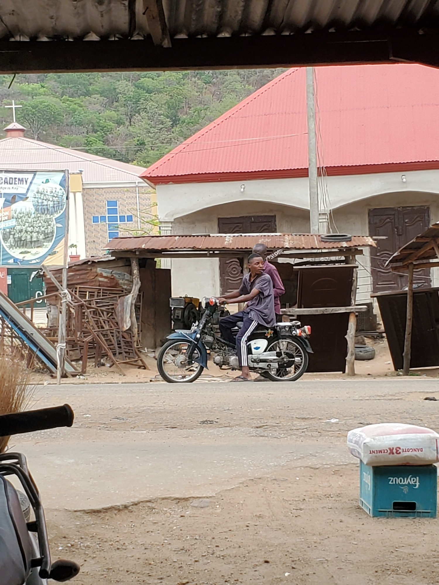 A man straddles a motorcycle in a street scene in Mararaba, Nigeria. He is wearing a dark shirt and pants with white stripes. On the side of the road is a bag of Dangote 3X cement and a Fayrouz crate.…read more