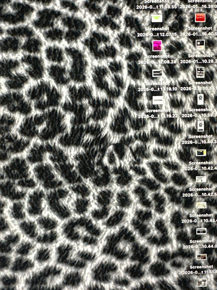 The image displays a close-up, textured black and white leopard print pattern, appearing to be a fabric or fur material, serving as a background. Superimposed on the right side of this pattern are mul…read more