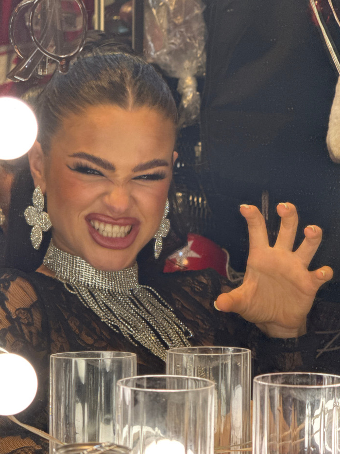 A person stares up at the camera, grinning widely with clenched teeth. They wear sparkly butterfly earrings and a matching necklace. Their hair is neatly pulled back. A hand with outstretched fingersβ¦read more