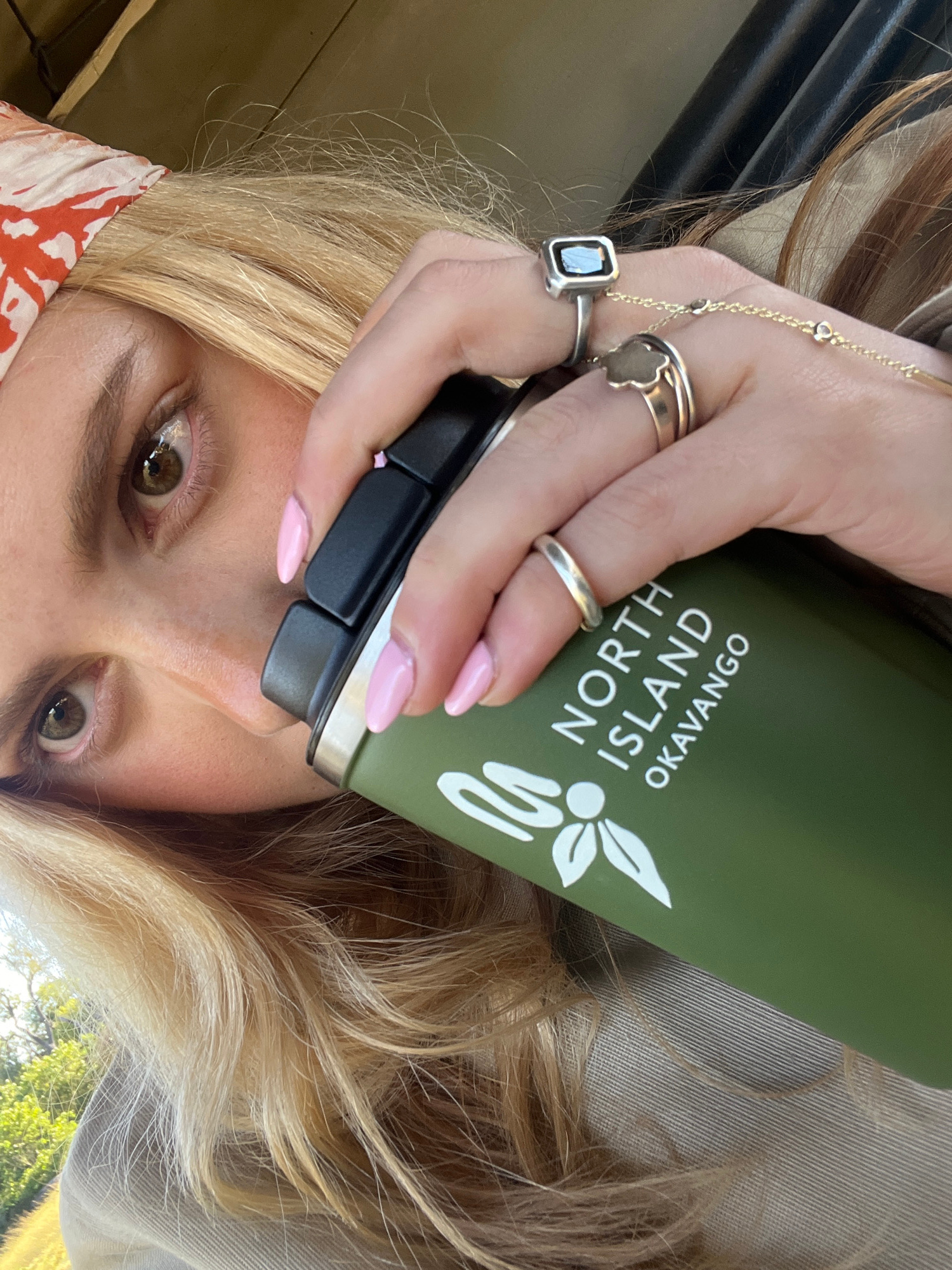 A woman with blond hair and light pink fingernails is holding a green water bottle with the logo "North Island Okavango" in white lettering. She is wearing multiple rings on her fingers, including a s…read more