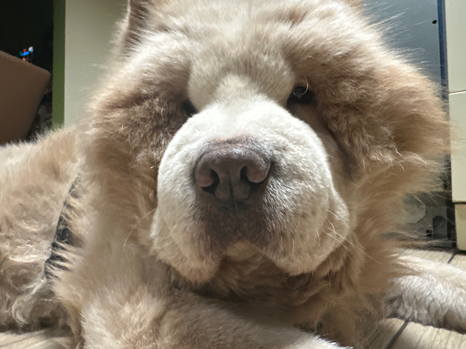 A close-up shot focuses on the face of a light brown, fluffy dog, possibly a Chow Chow or similar breed. The dog's face fills the frame, with its large, wet nose prominently displayed. Its eyes are pa…read more