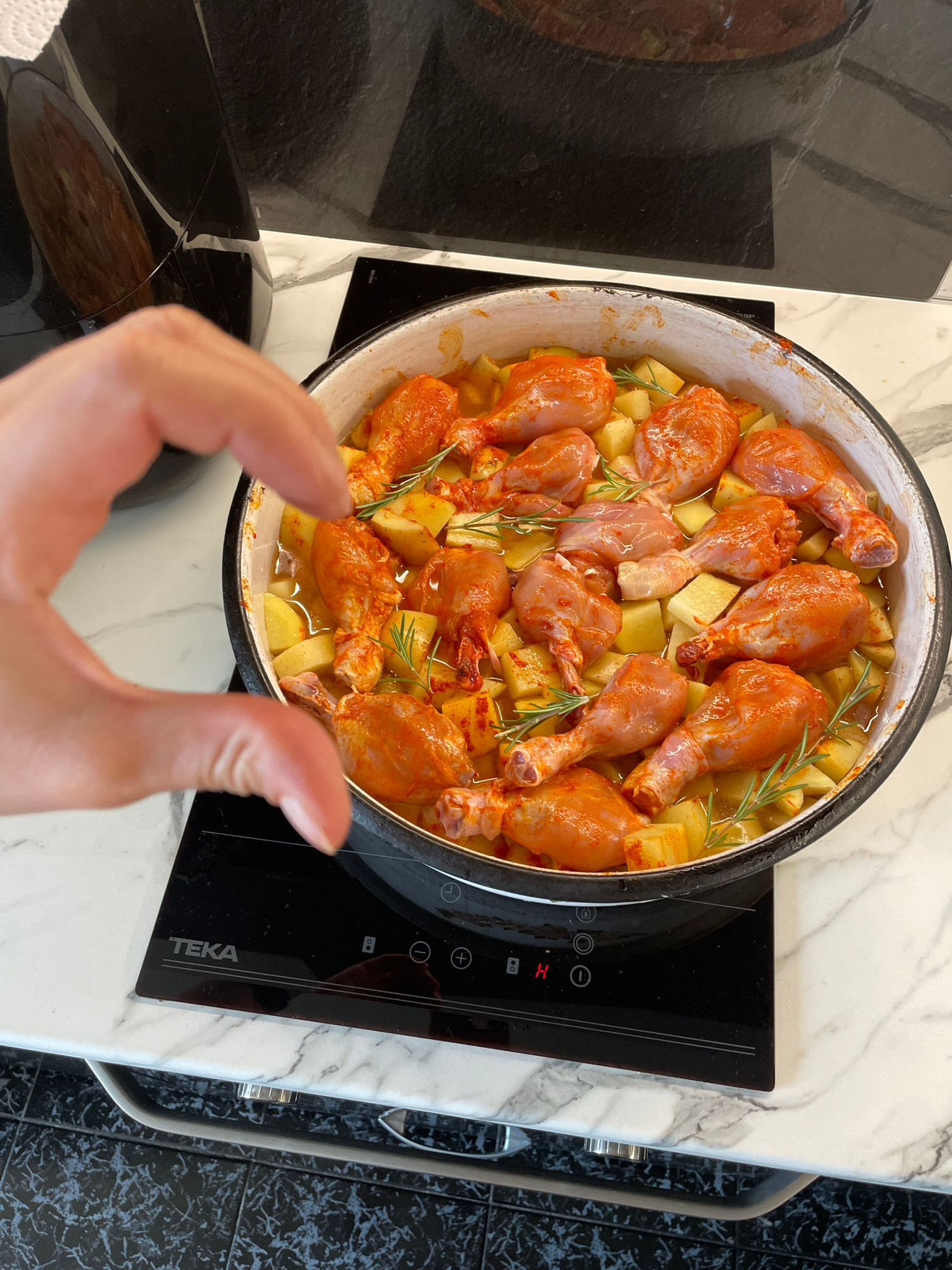 A top-down shot shows a large, white, round, cast-iron pot filled with raw chicken drumsticks, cubed potatoes, and rosemary sprigs. The chicken is coated in a reddish spice blend. The pot sits on a black TEKA induction cooktop, which is set into a white marble countertop. To the left of the cooktop, a reflection shows on a glossy black surface, possibly a countertop or appliance. In the foreground, a hand is reaching towards the pot, fingers slightly curved. The countertop on the right side extends to a section with a black and white tiled surface. The image was likely taken indoors in a kitchen. There is no explicit information to ascertain if the image was taken in Sofia, Bulgaria. | Open Wire
