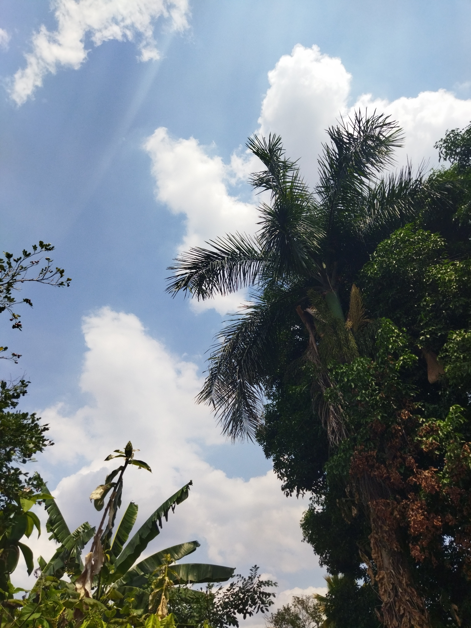 The image, likely taken in Tinaquillo, Venezuela, presents a low-angle view towards a partly cloudy sky. The sky is predominantly blue with scattered cumulus clouds. A palm tree is centrally positione…read more
