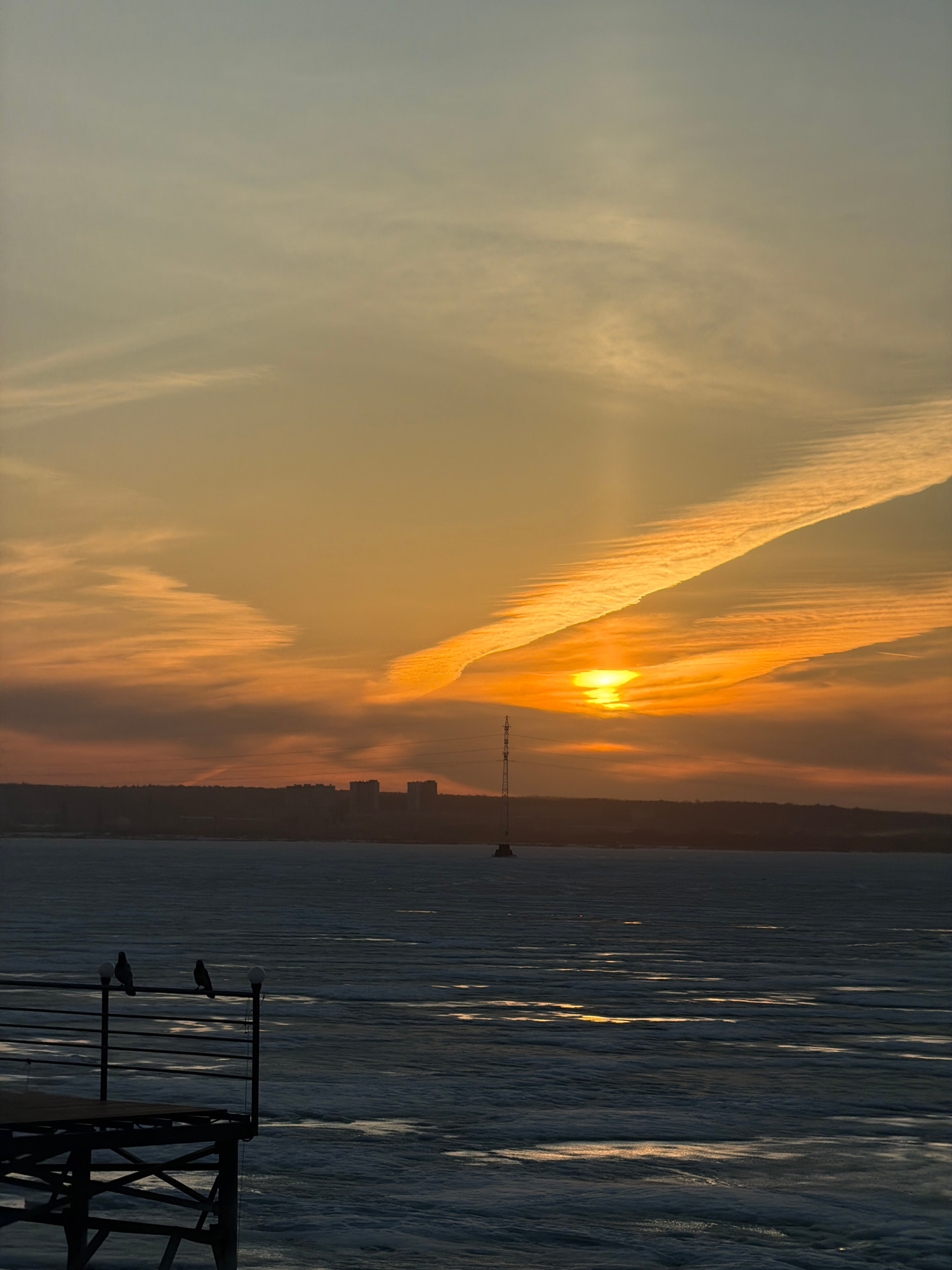 The image depicts a sunset over the Izhevsk Reservoir in Izhevsk, Russia. The sun is partially obscured by thick, striated clouds, creating a golden glow. In the distance, the silhouetted skyline of t…read more