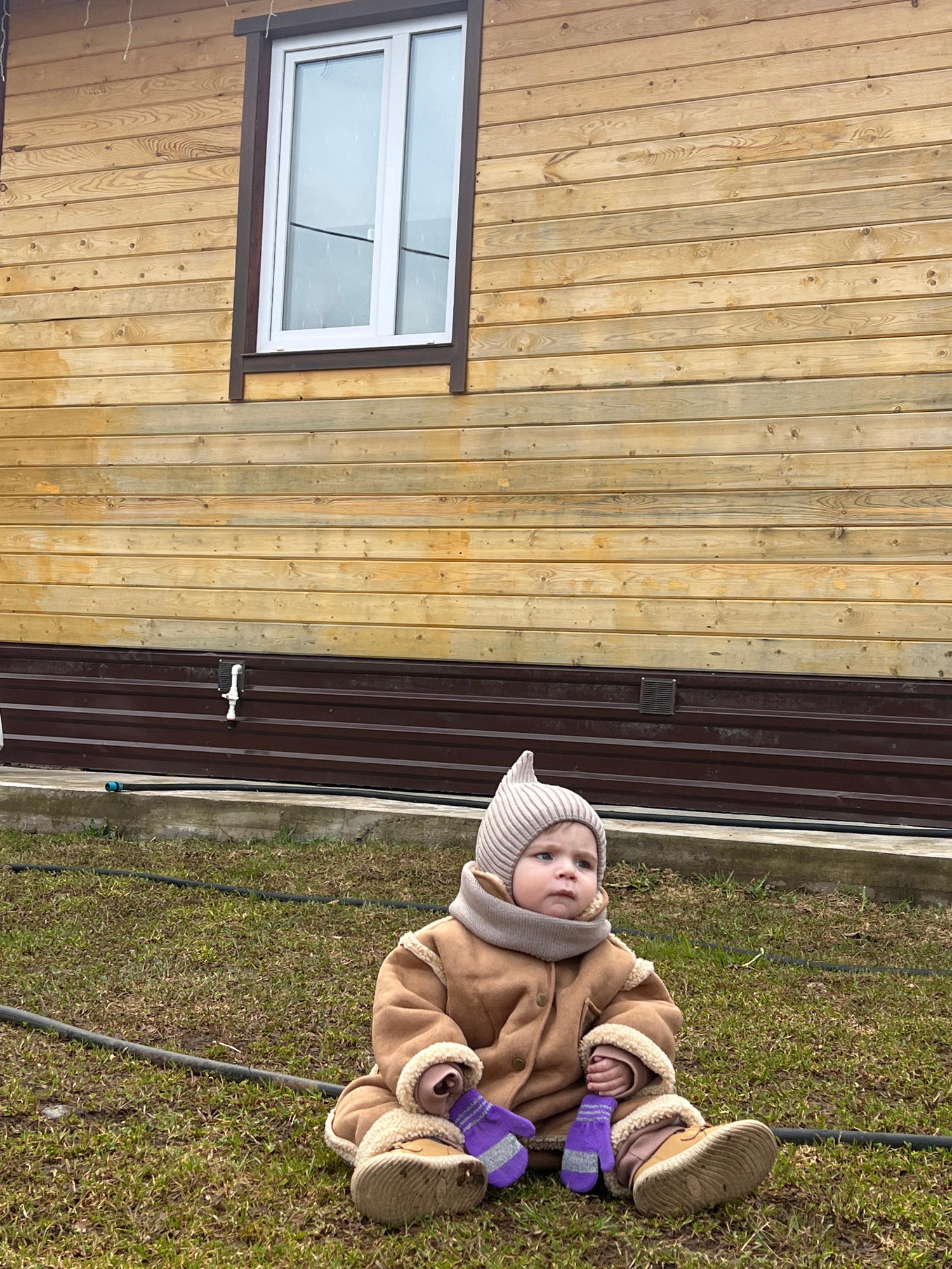 A young child, appearing to be a toddler, is seated on green grass in an outdoor setting, likely a backyard in Protasy, Russia. The child is warmly dressed for cool weather, wearing a light-colored ri…read more