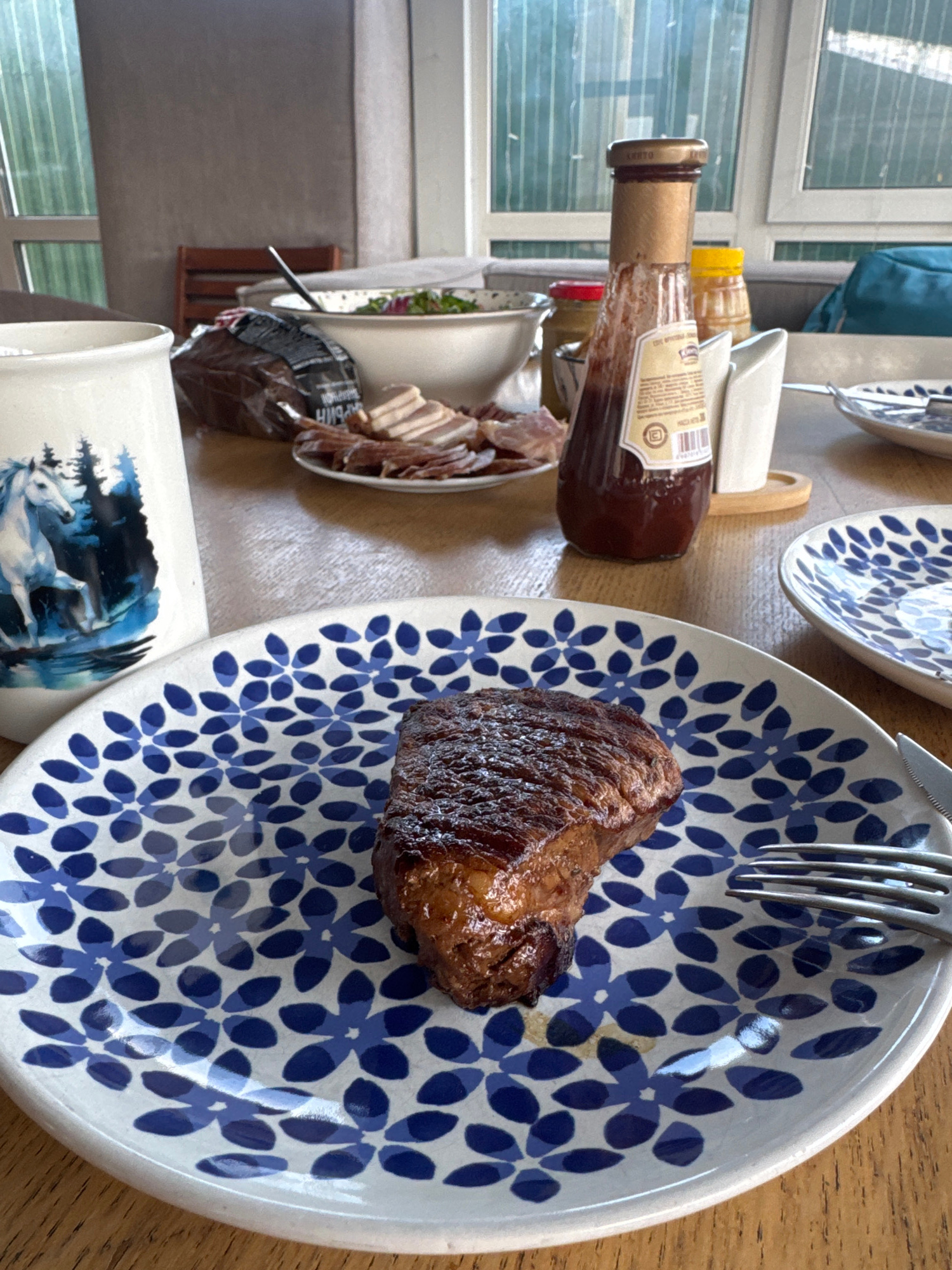 This image captures a tabletop setting prepared for a meal, likely in Ptichnoye, Russia, during daylight hours. No people are visible in the frame. The central subject is a single portion of browned,…read more