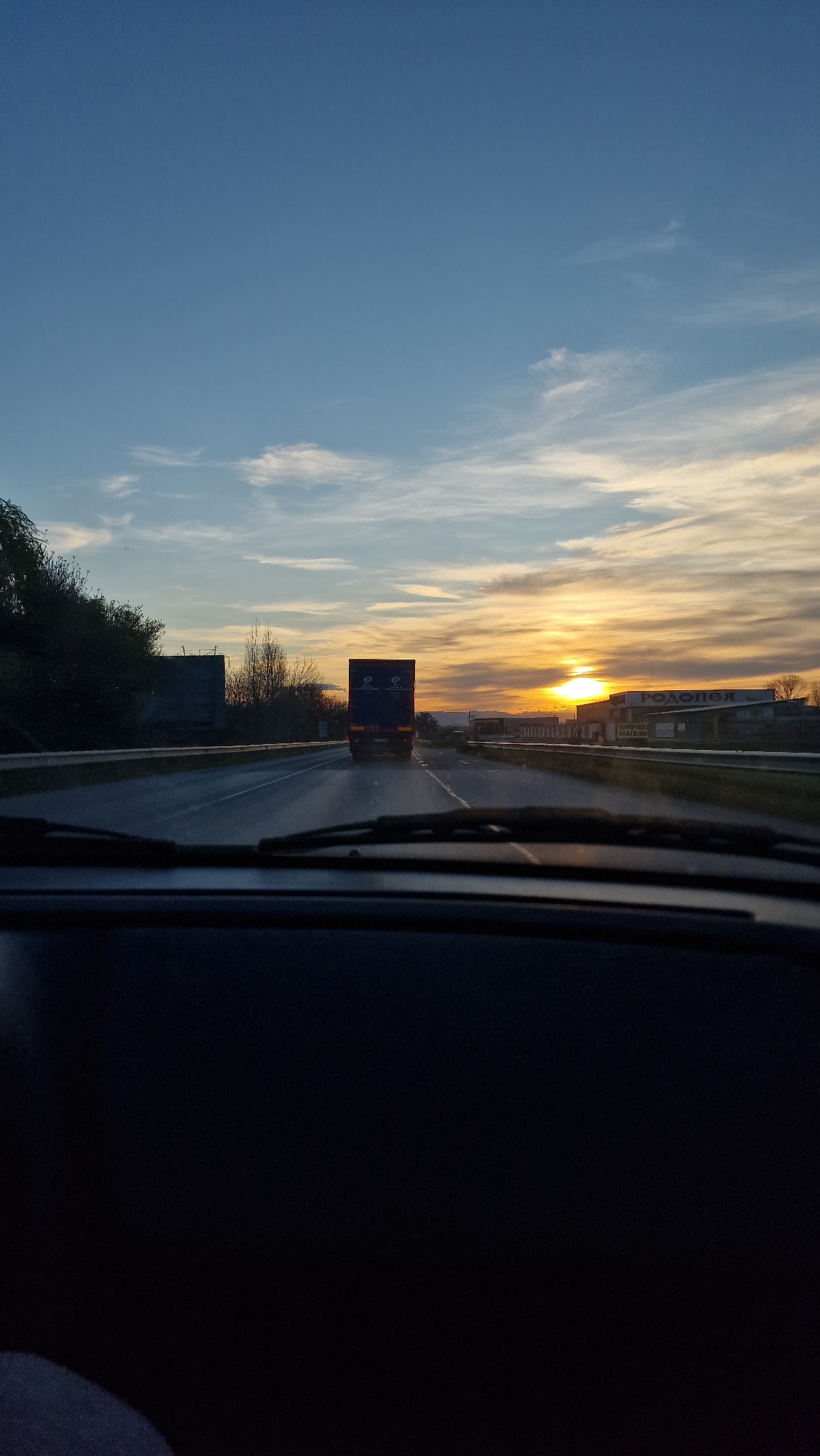 The image shows a view from inside a vehicle, likely a car or truck, driving on a road. The road appears to be a highway or a large multi-lane road based on the presence of a truck ahead. The sun is s…read more