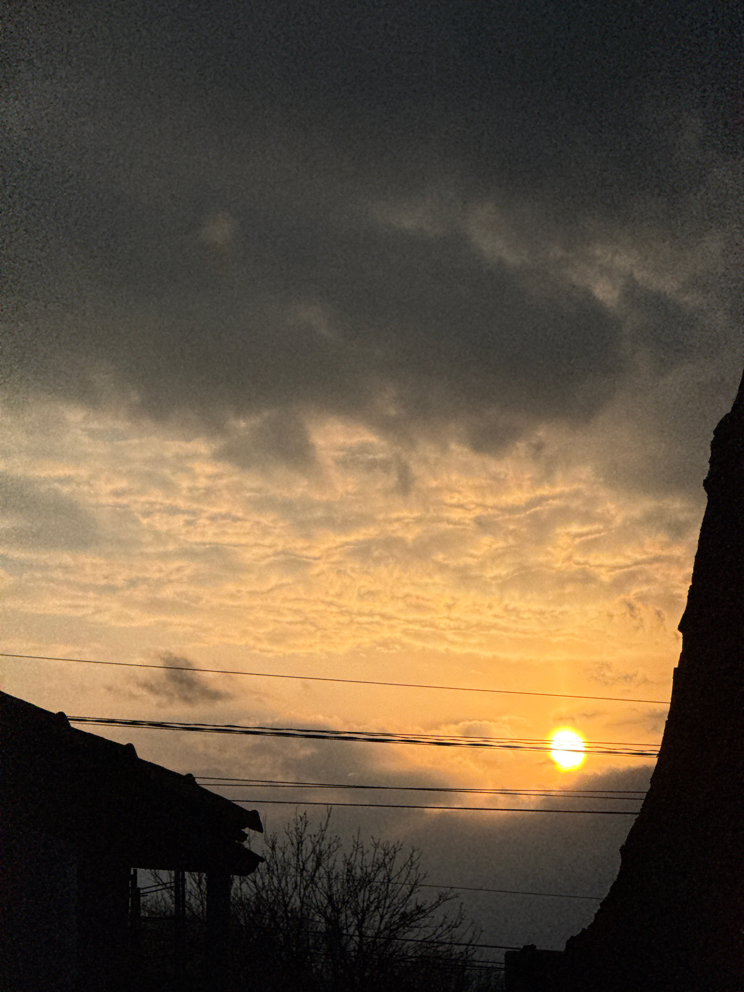 The image depicts a twilight scene with a bright sun partially obscured by thin clouds. The view is framed by a dark, possibly built structure in the foreground, suggestive of a building or roofline.…read more