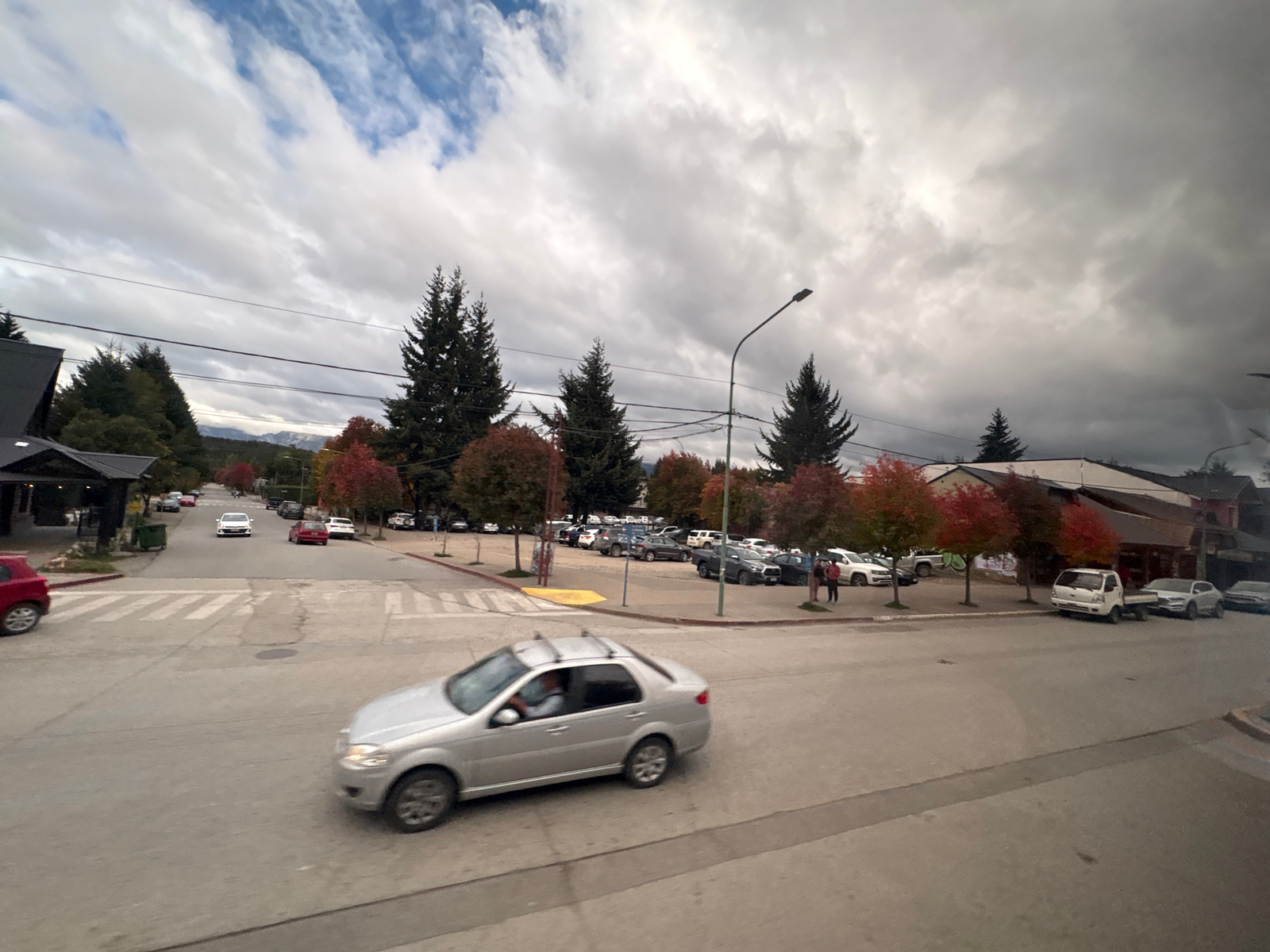 The image depicts a street scene in Villa La Angostura, Argentina, under an overcast sky. A silver sedan is moving from left to right across a four-way intersection with marked crosswalks. Various par…read more