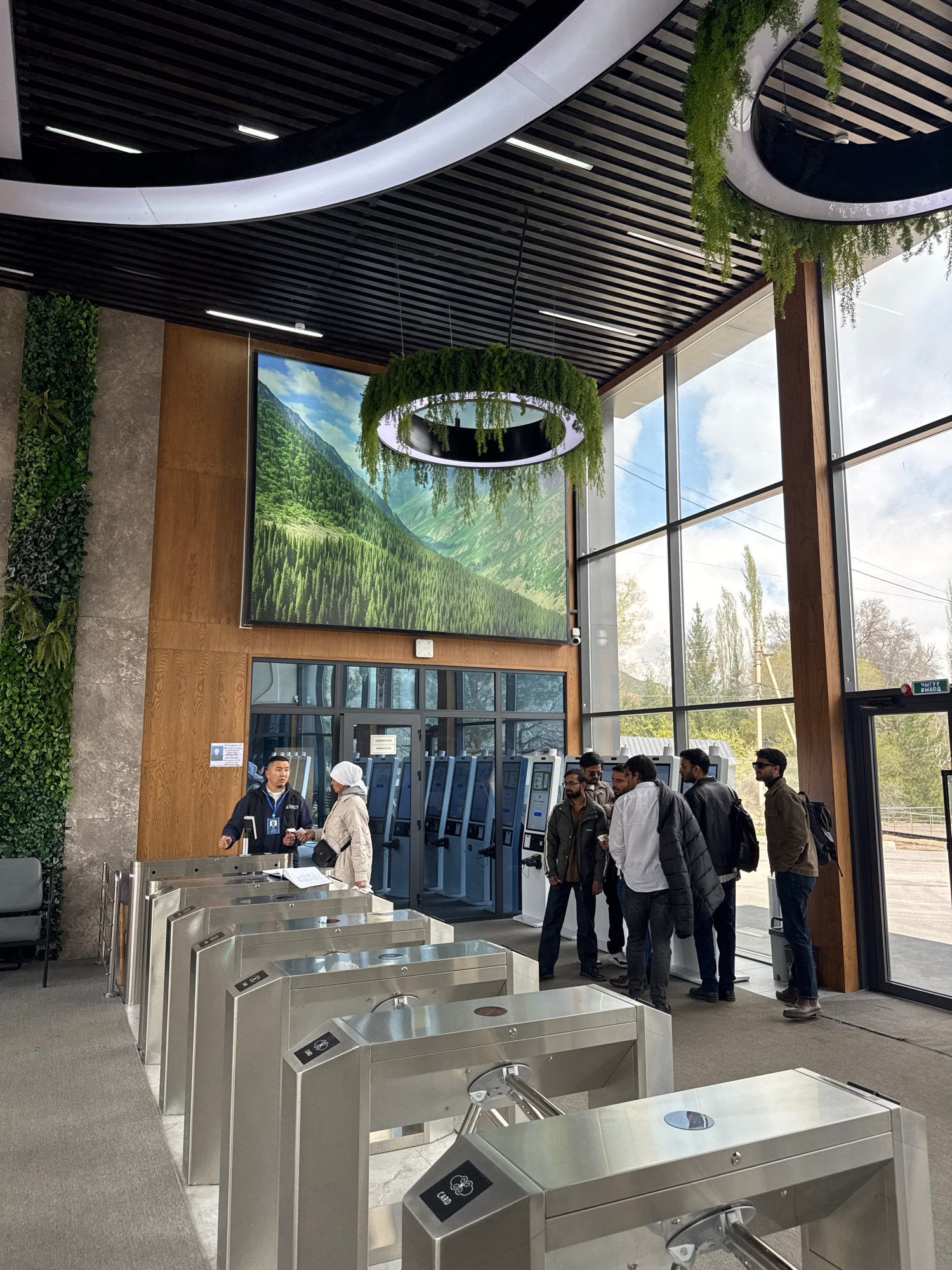 The image shows a modern entrance area, likely in Kashka Suu, Kyrgyzstan, judging by the context. A queue of at least seven people is waiting to pass through a series of metal turnstiles. These turnst…read more