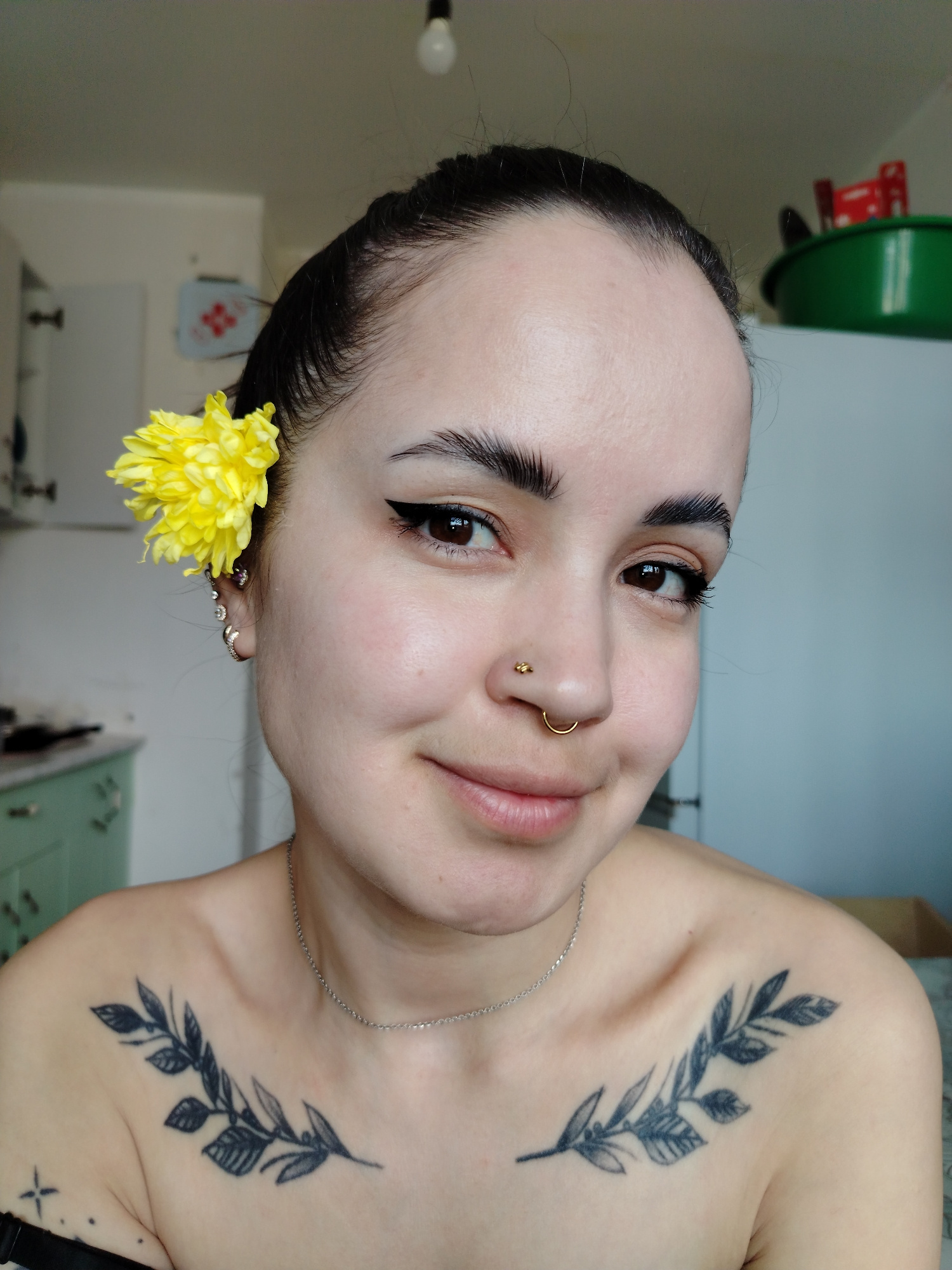 A close-up portrait shows a young woman with dark hair pulled back, adorned with a yellow flower behind her left ear. She has fair skin, well-defined eyebrows, brown eyes with eyeliner, and piercings…read more