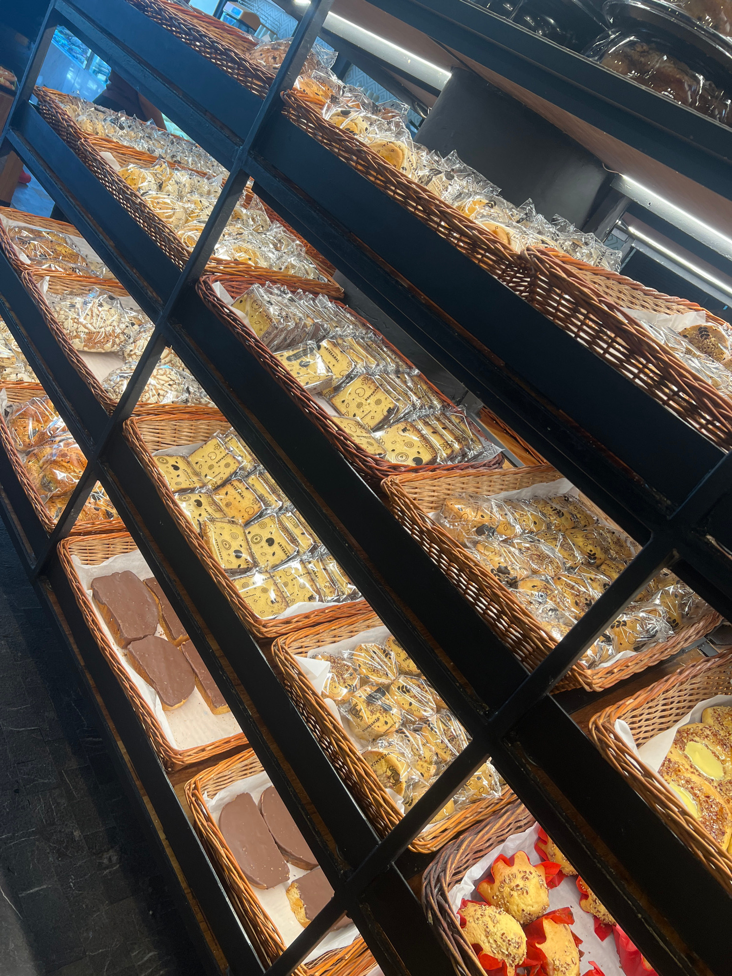 The image shows a low-angle shot of shelves filled with wicker baskets containing baked goods, possibly in Mexico City, Mexico. The shelves are organized into a black metal grid structure, with the ba…read more