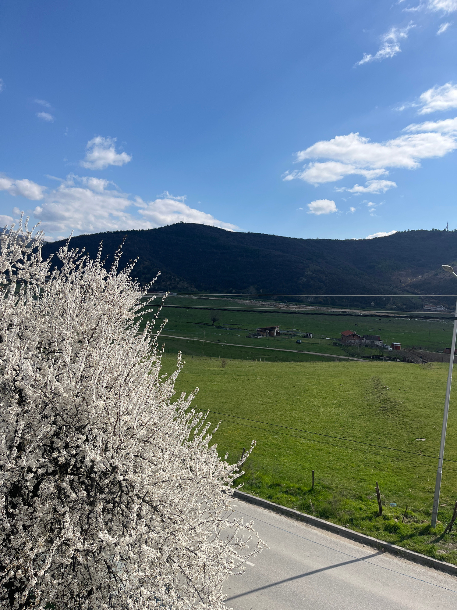 The image shows a landscape with a mountain on the left side and a green field with buildings on the right side. The sky is blue with white clouds. In the foreground, there is a flowering tree with wh…read more