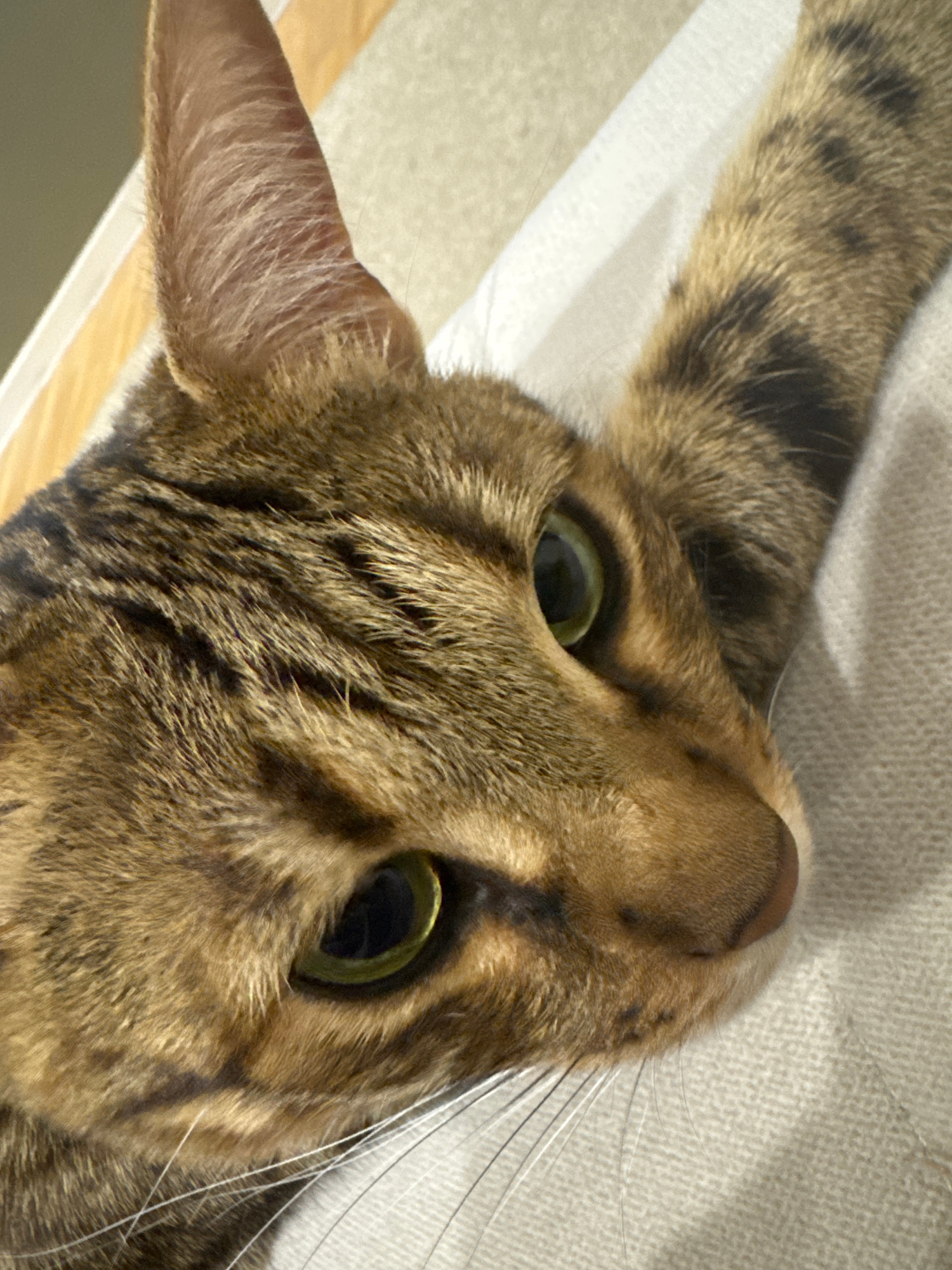 A close-up, angled photograph depicts a domestic cat, located in the city of Votkinsk, Russia. The animal's fur is predominantly tawny with distinct dark brown spots and stripes, consistent with a Ben…read more