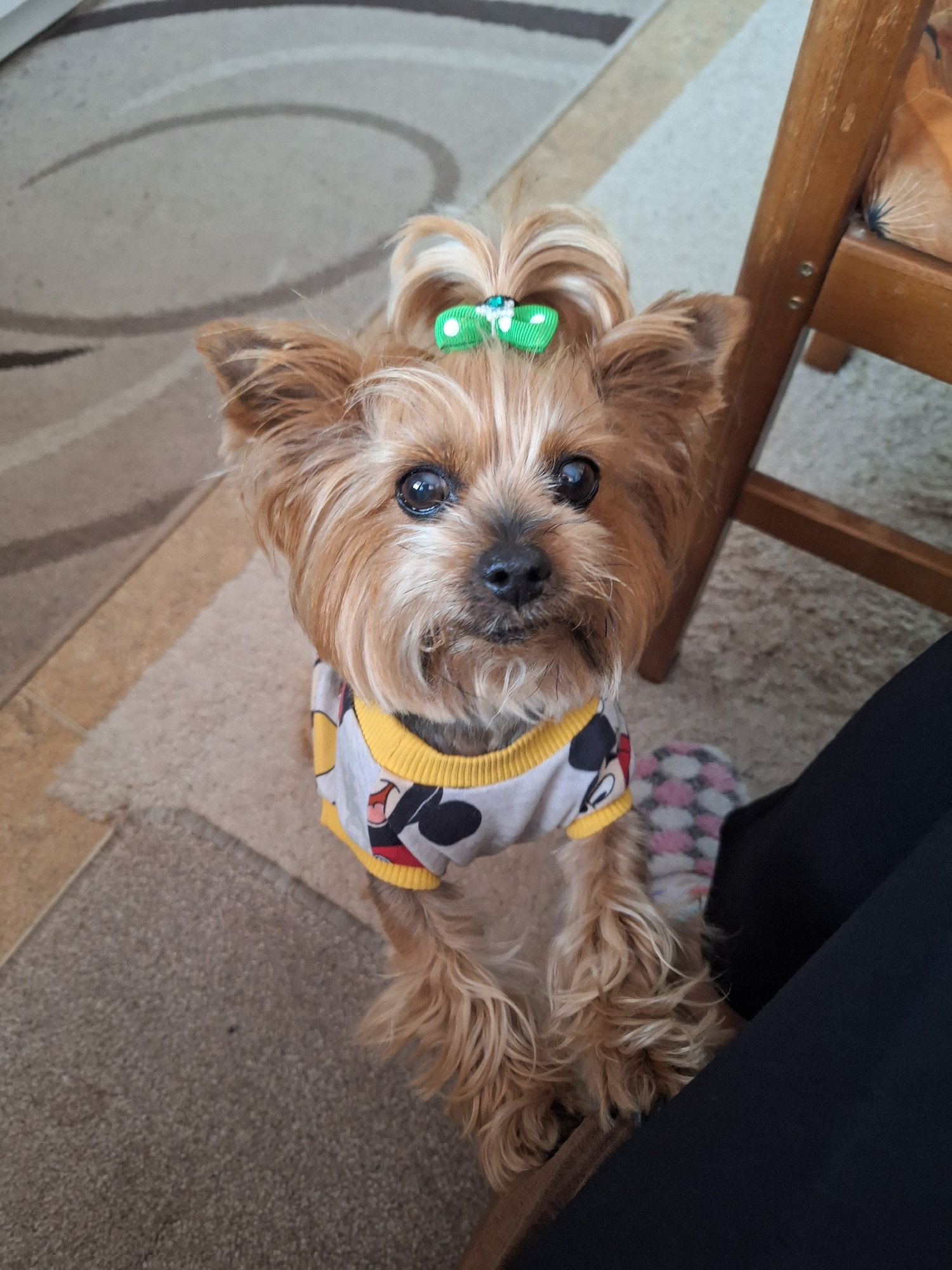 A tan, long-haired Yorkshire Terrier wearing a grey and yellow Mickey Mouse shirt and a green bow in its hair, sits on a carpeted floor in what appears to be a home. Its head is tilted upward, looking…read more