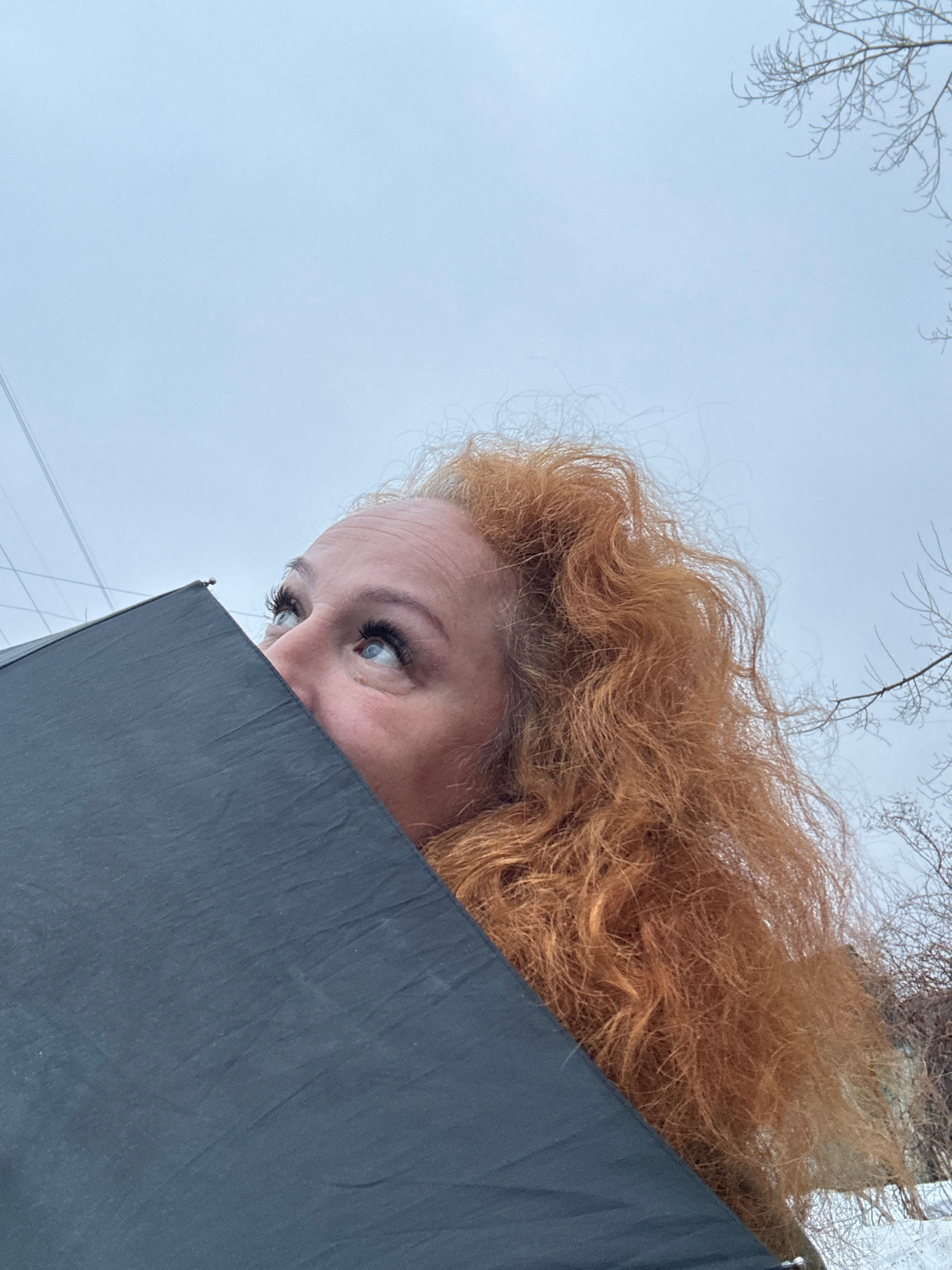 A low-angle, upward-facing shot captures a person with ginger, curly hair partially obscured by a dark gray umbrella. The umbrella occupies the lower right portion of the frame. Only the person's eyes…read more