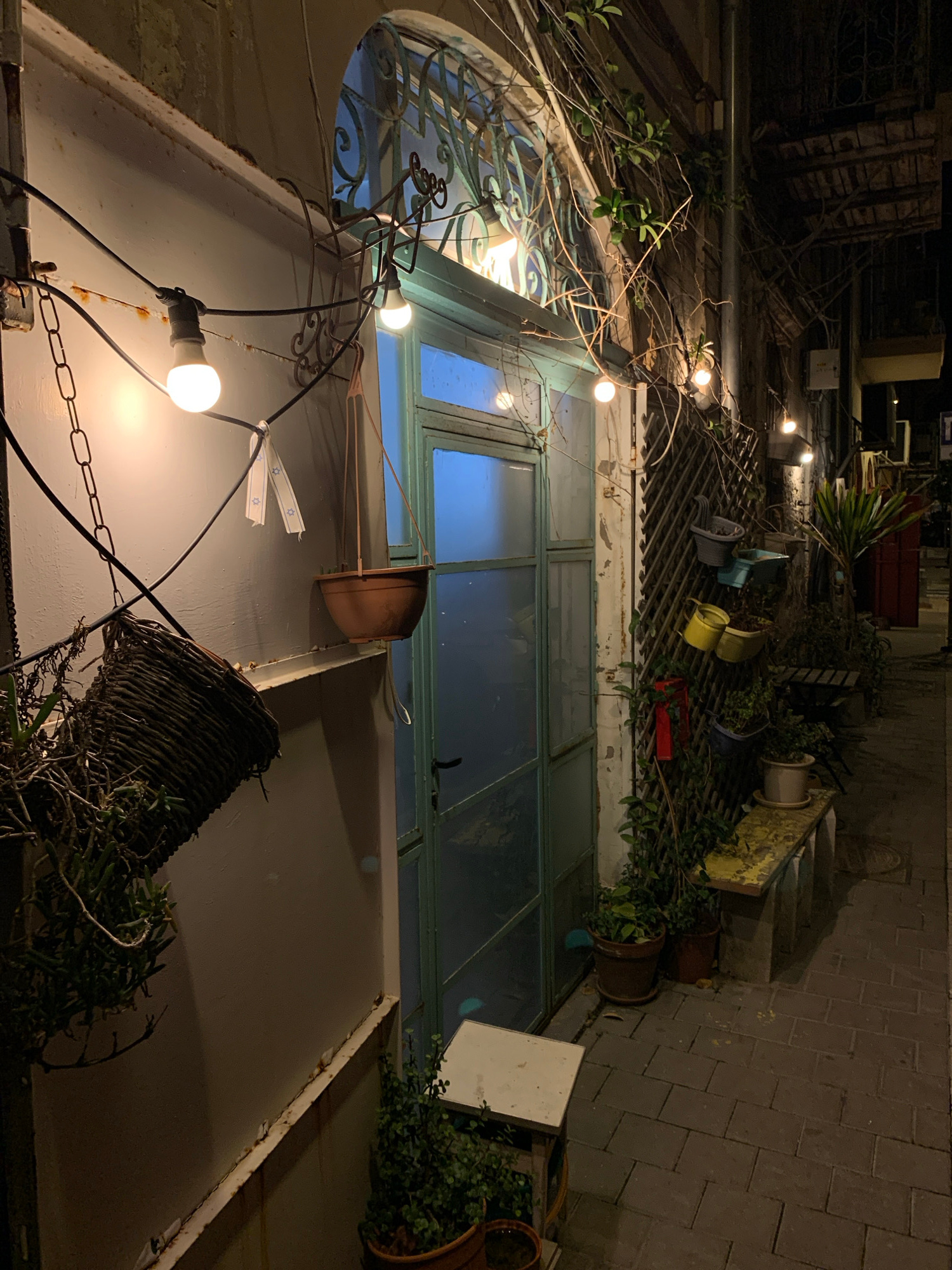 The image captures an outdoor scene in Tel Aviv, Israel, at night. A building façade with a large window occupies the center. The window is divided into multiple panes and has an arched top with ornat…read more