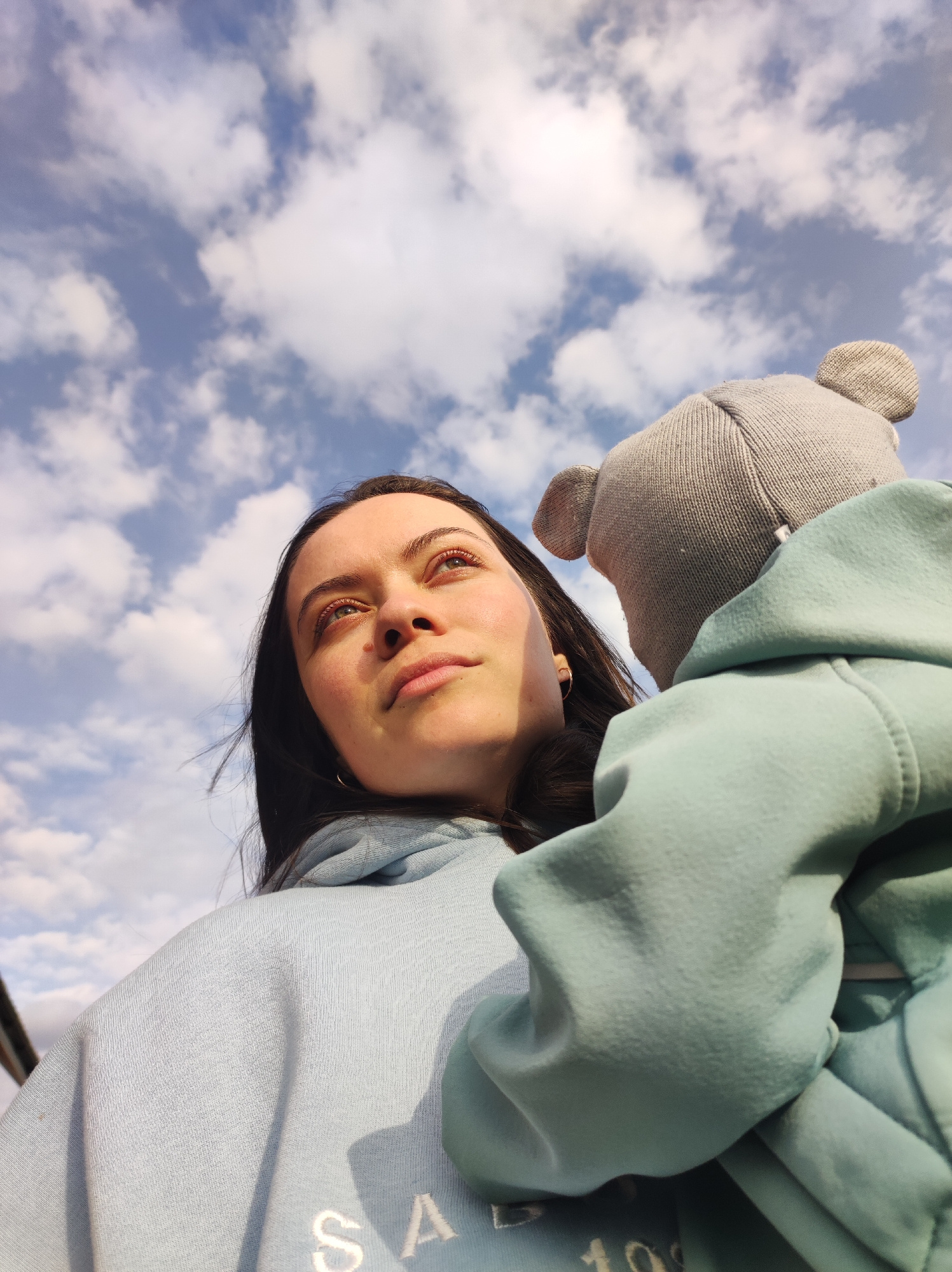 A low-angle shot captures a young woman and a child or infant against a bright, partly cloudy blue sky, likely in Фоки, Russia. The woman, with long dark hair, occupies the left side of the frame, loo…read more