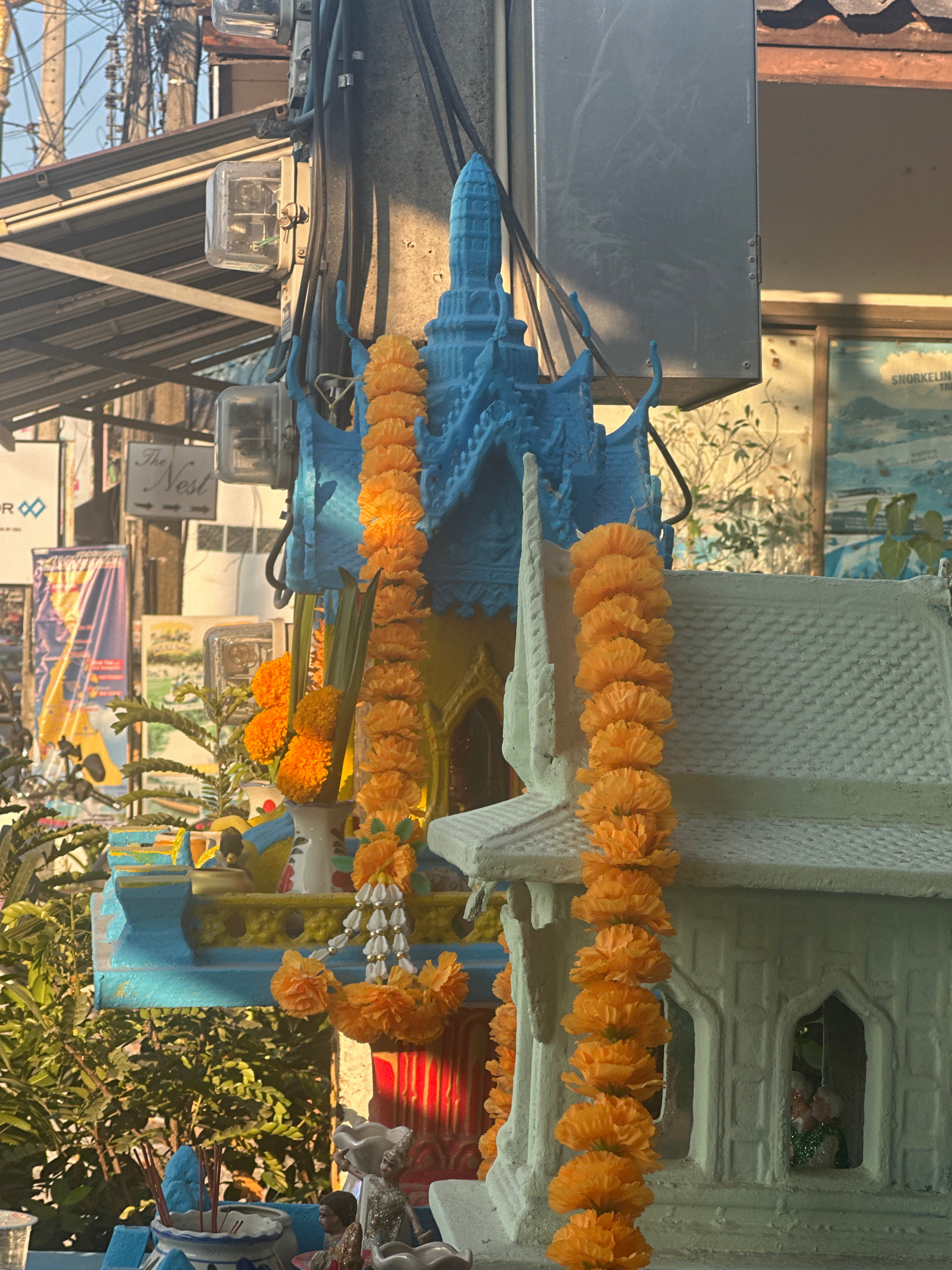 The image depicts a spirit house, a common sight in Thailand, particularly in urban areas like Baan Bang Rak. The spirit house is adorned with strings of orange marigold garlands, indicating offerings…read more