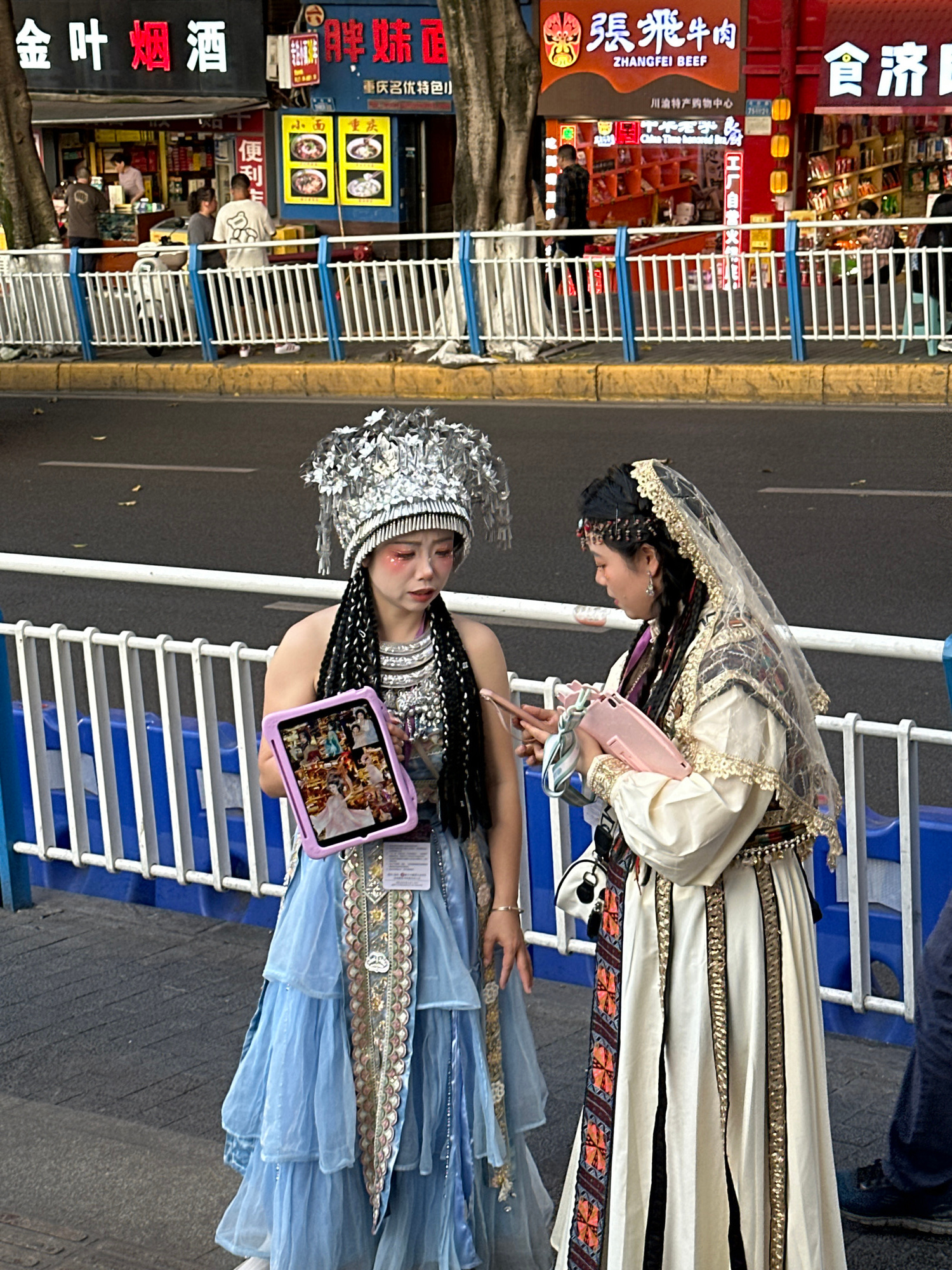 The image shows two women in traditional clothing standing near a blue and white barricade, likely a safety barrier along a street. The woman closest to the camera is wearing a silver headdress, elaboβ¦read more