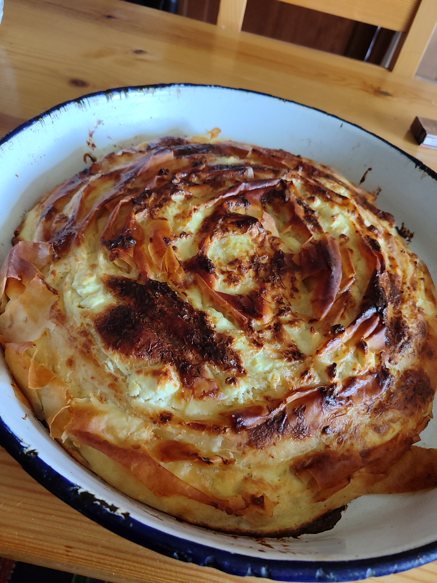 A close-up shot shows a baked cheese phyllo pie, likely homemade, nestled in a white enamel baking dish with a blue rim. The pie exhibits a circular design with flaky, golden-brown phyllo pastry arran…read more