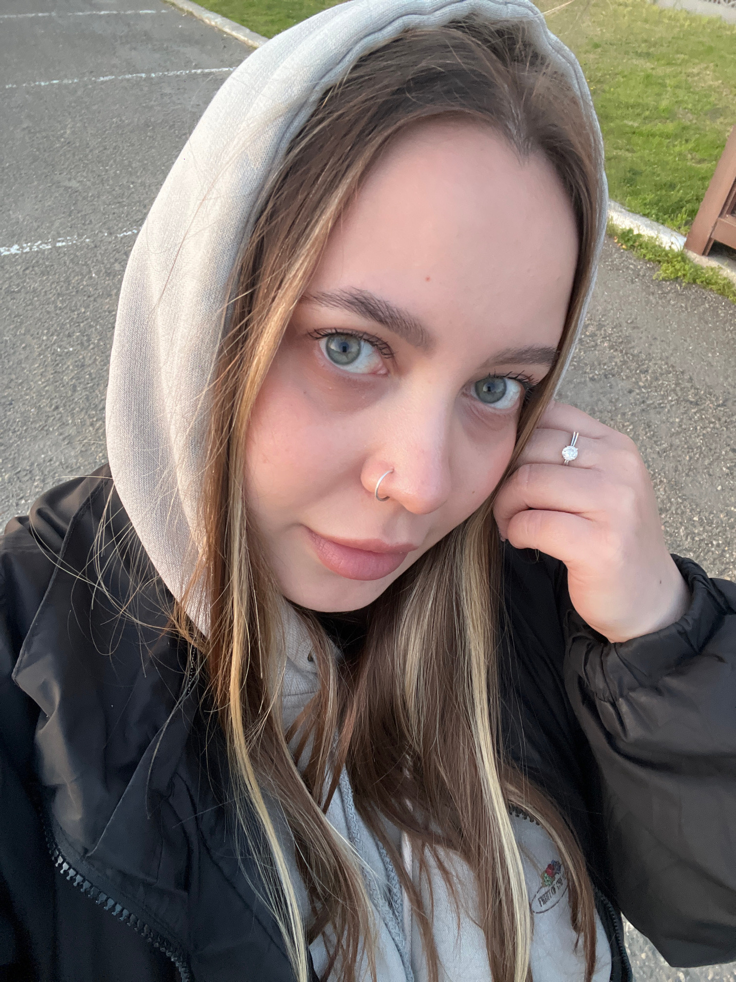 A close-up, angled selfie captures a young woman outdoors in Novopokrovskaya, Russia, during daytime. The woman, likely in her late teens or early twenties, has long light brown hair with prominent bl…read more