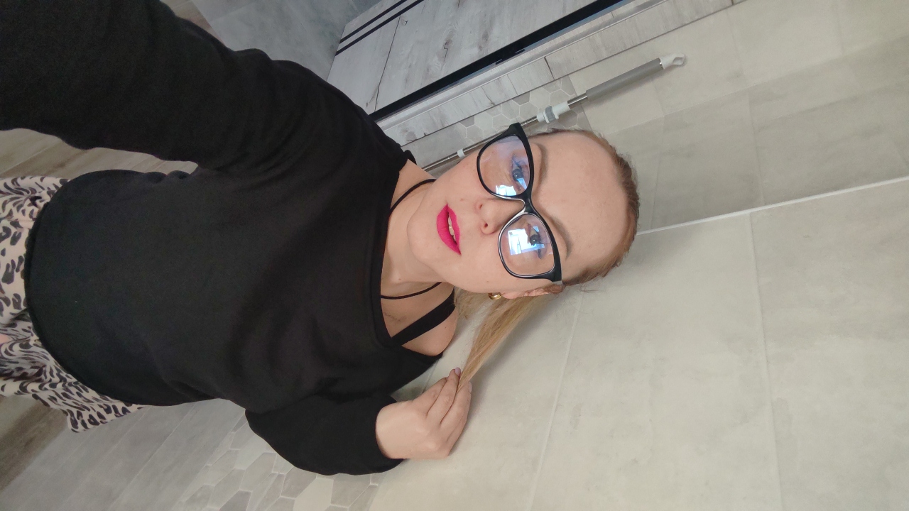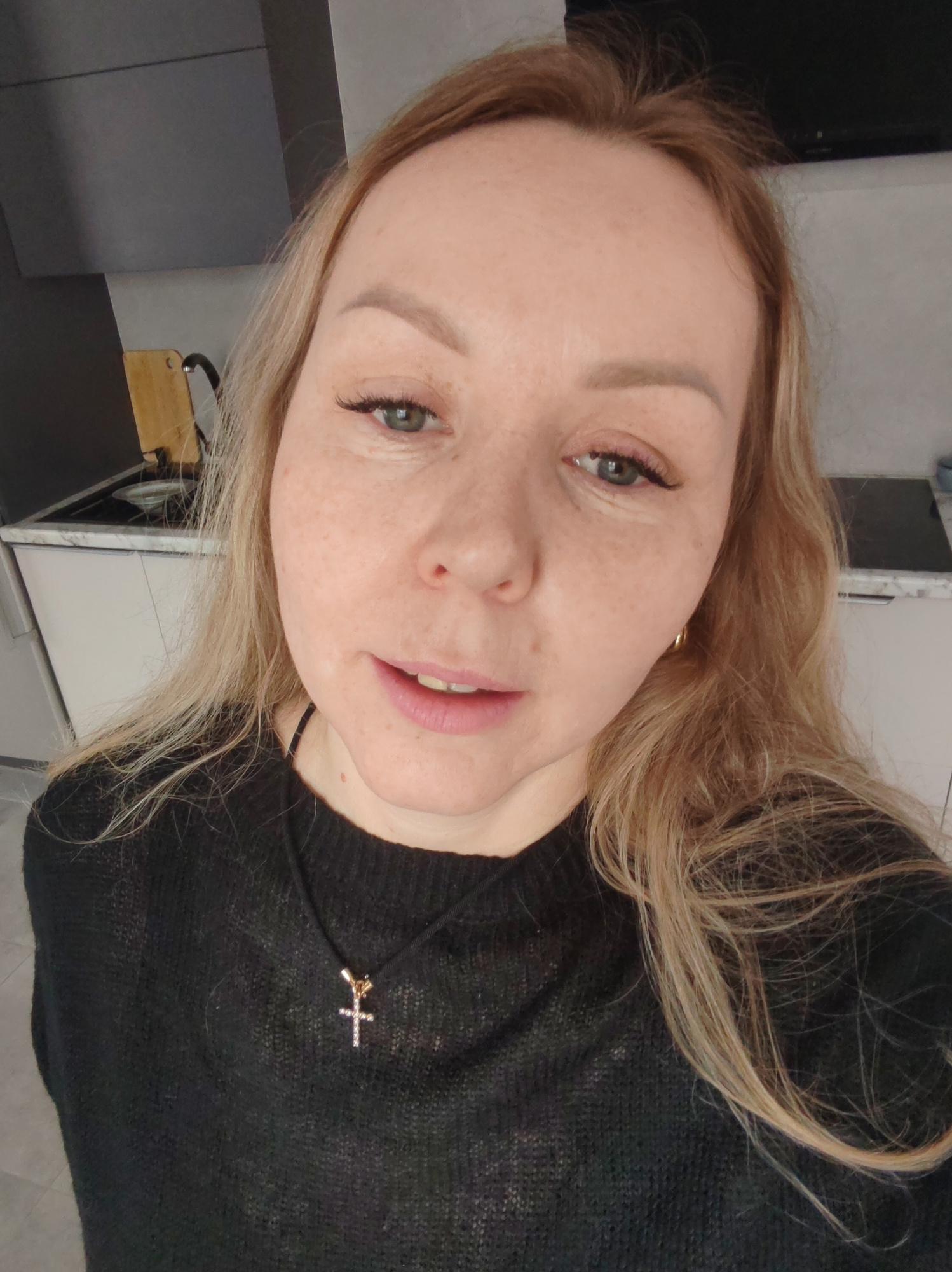 A selfie of a woman with light blonde hair and green eyes wearing a black sweater and a cross necklace. The background shows a kitchen with white cabinets and a grey countertop. Based on the prompt, i…read more
