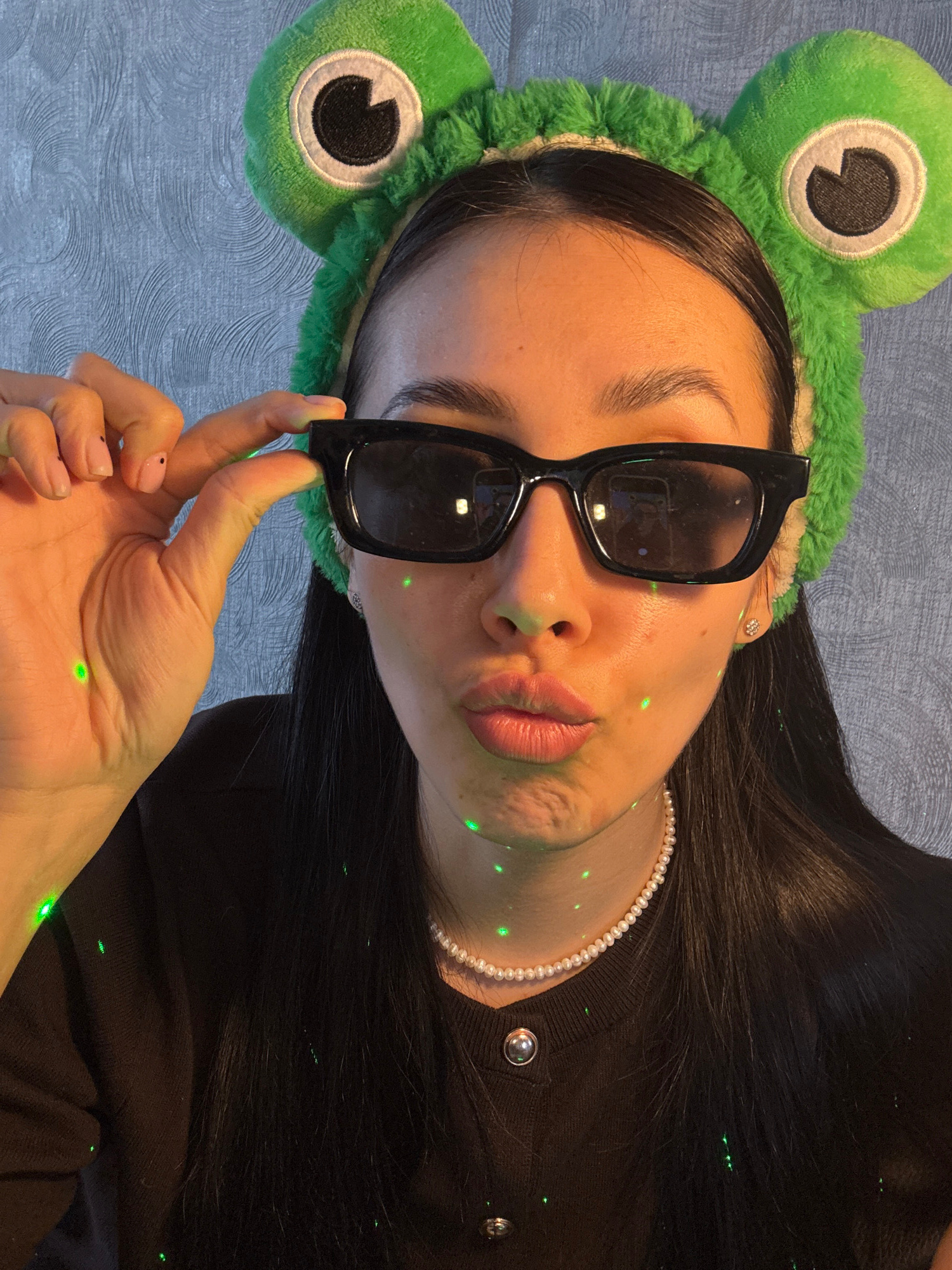 A woman with dark hair is lying down, wearing sunglasses and a green frog-themed headband. She is holding the sunglasses with her hand. She is also wearing a pearl necklace and a black cardigan. Green…read more