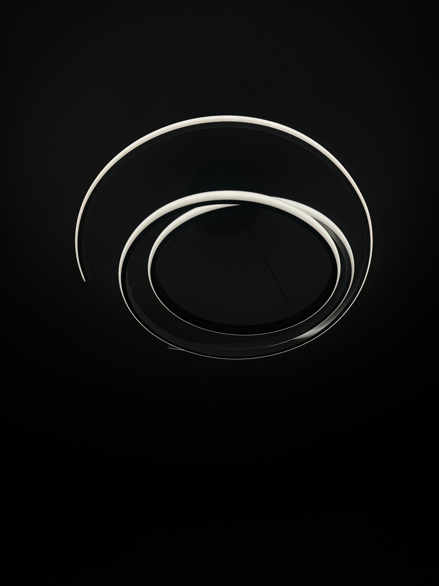 A minimalist, low-key image of a contemporary light fixture against a black background. The fixture consists of three concentric circular elements, two of which are lit with a bright white light sourc…read more