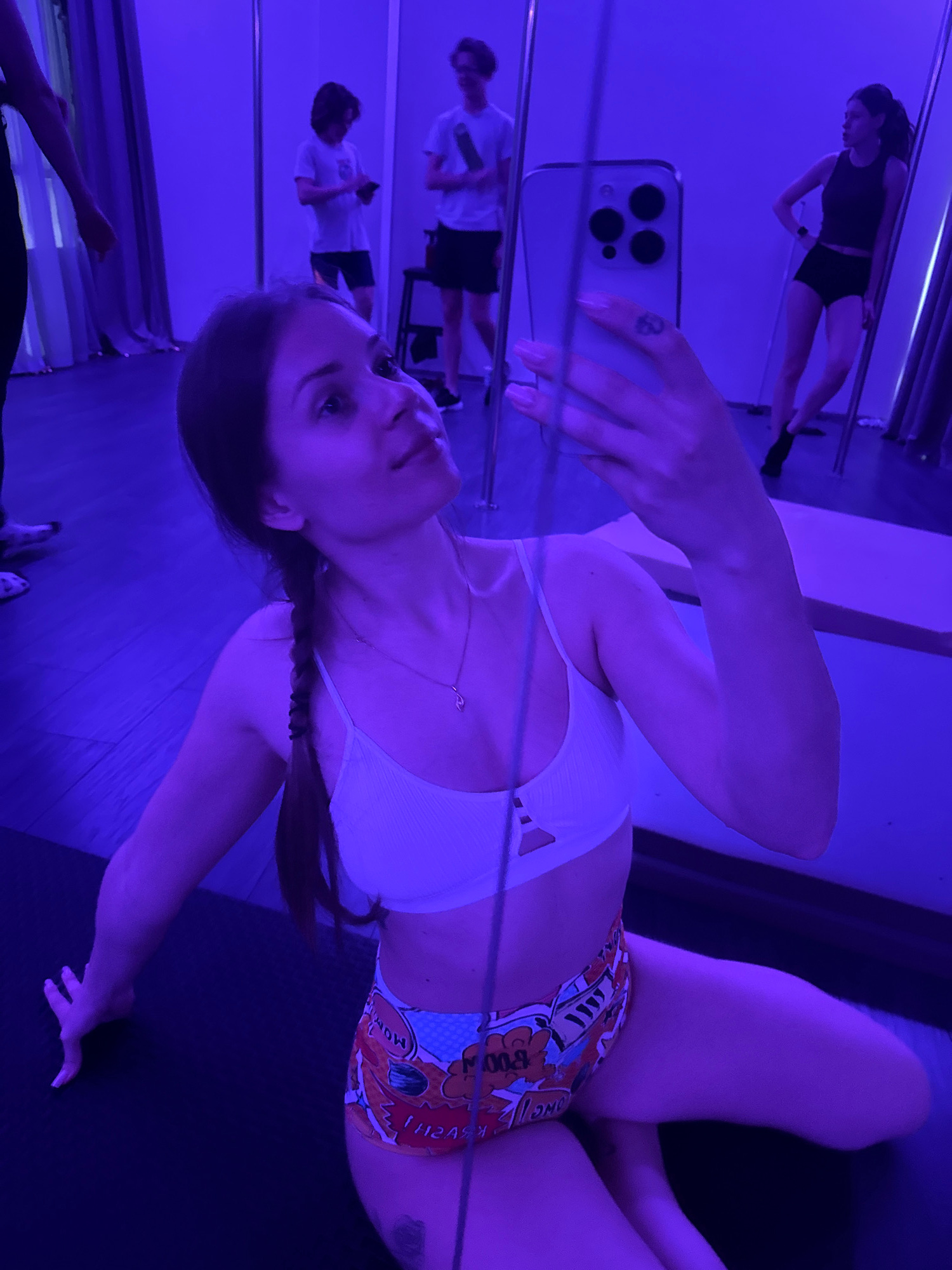 A woman is taking a selfie in front of a mirror. The lighting is a strong blue hue. She is wearing a white sports bra and patterned shorts. In the mirror's reflection, there are other people, one in b…read more