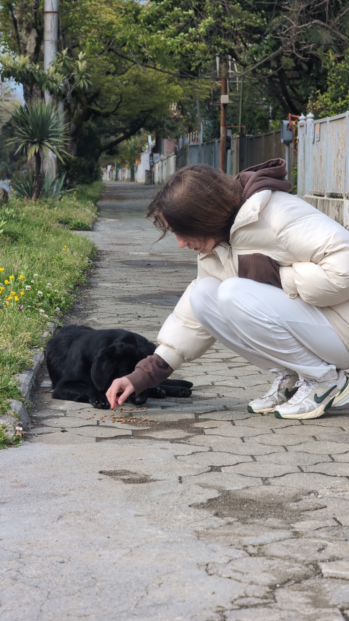 A young person with brown hair is crouching on a paved walkway. They are wearing a cream-colored puffer jacket, a brown hoodie, and white pants. The person is extending their hand towards a black dog,…read more