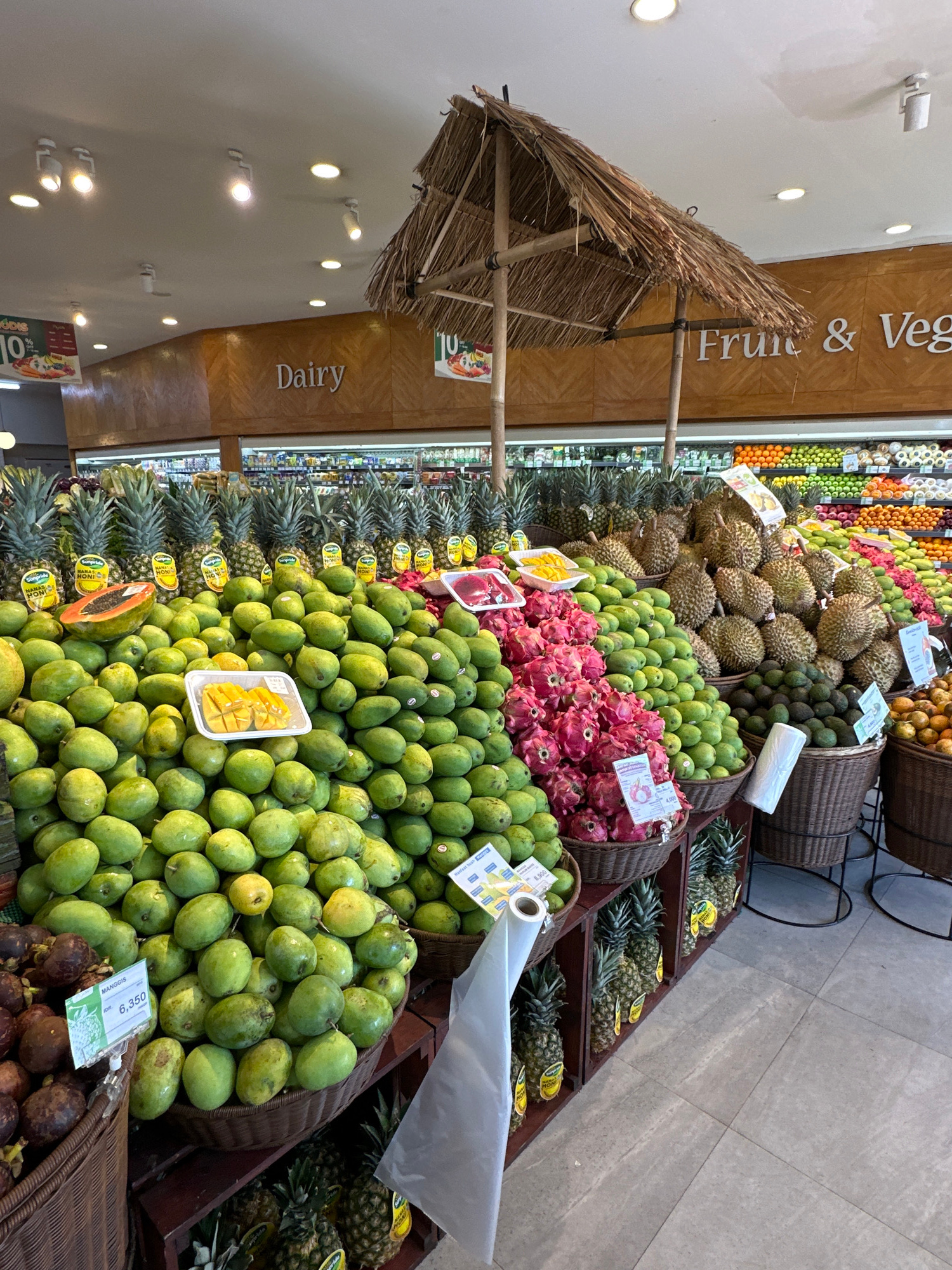 The image shows a colorful display of various fruits in a market or grocery store in North Kuta, Indonesia. The foreground features arrangements of green mangos, pineapples, dragon fruits, durians, an…read more