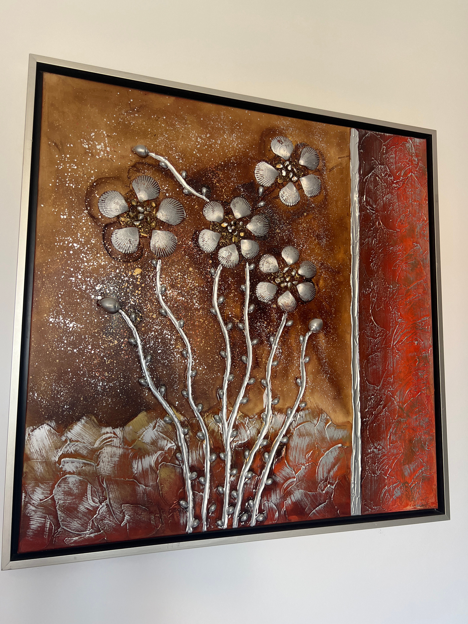 This image features a framed piece of mixed-media wall art displayed on a plain, light-colored wall, likely within an interior setting in Petrovac centar, Montenegro, as indicated by the context. The…read more